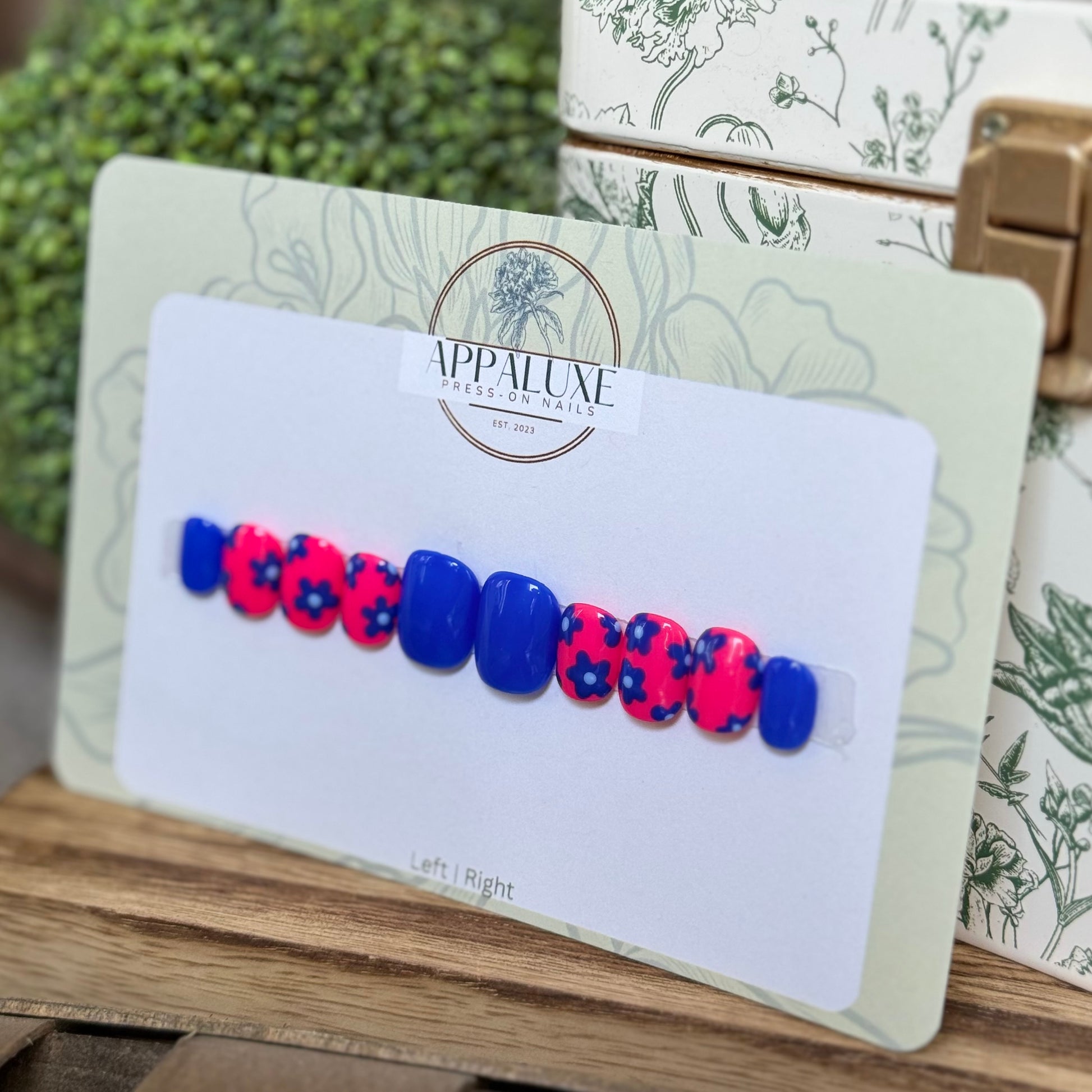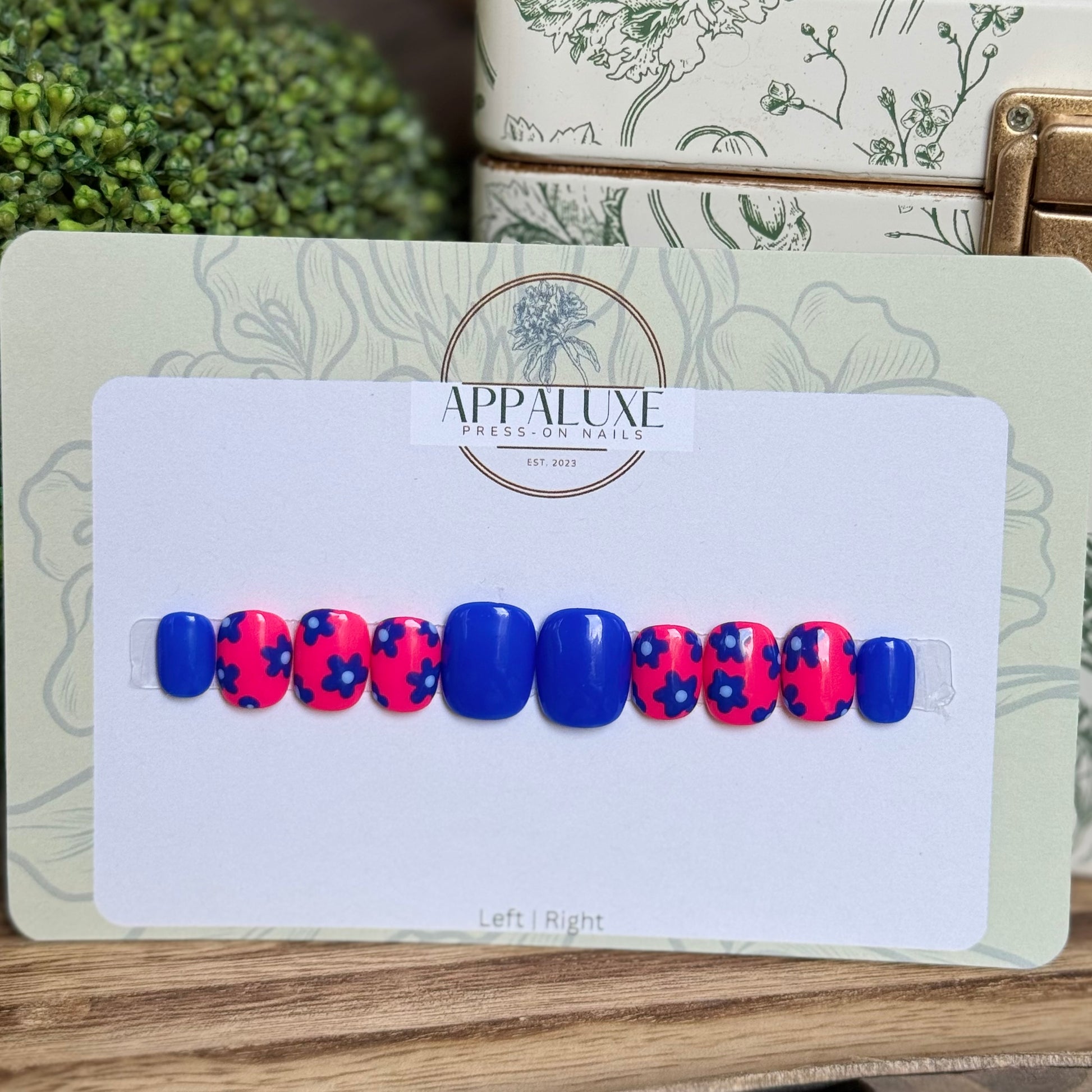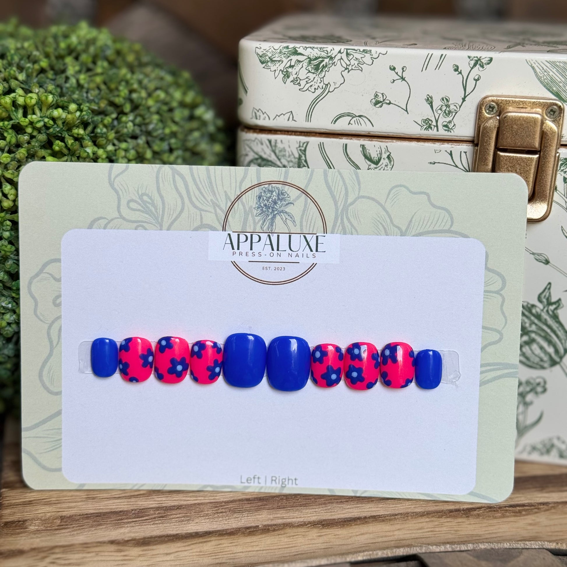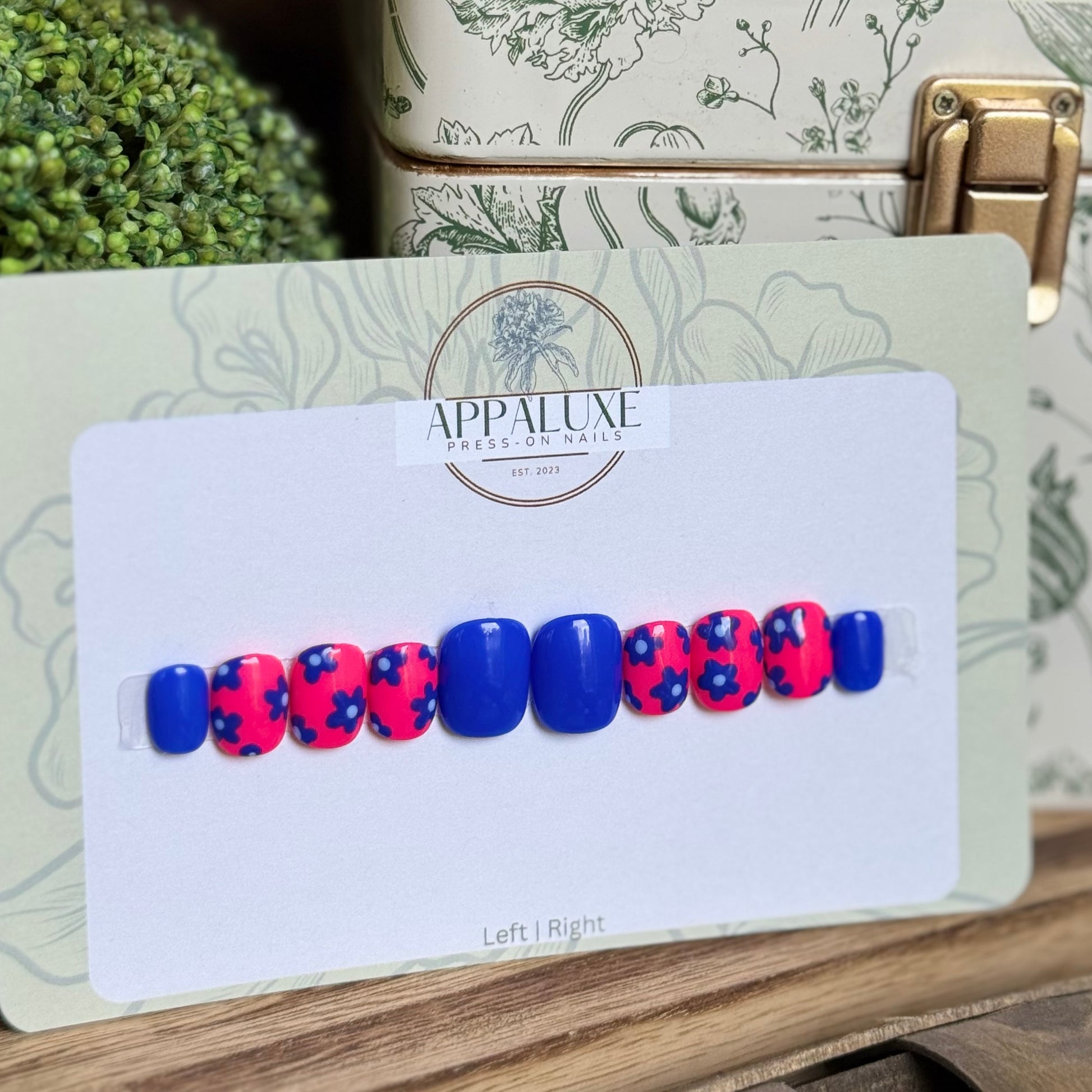 Turn heads with AZURE BLOOM press on nails featuring bright blue and bold pink, accented by bold flowers. No salon needed!