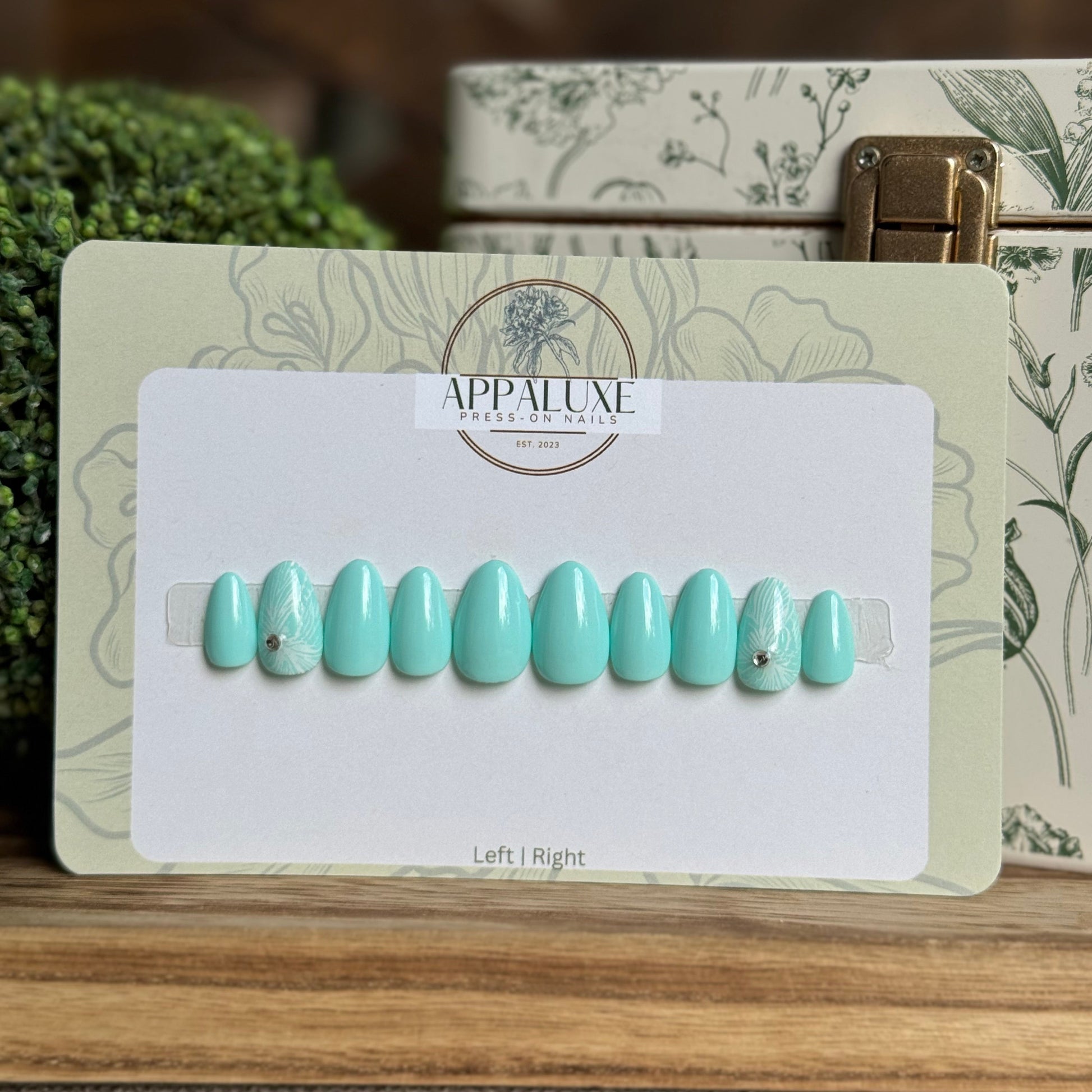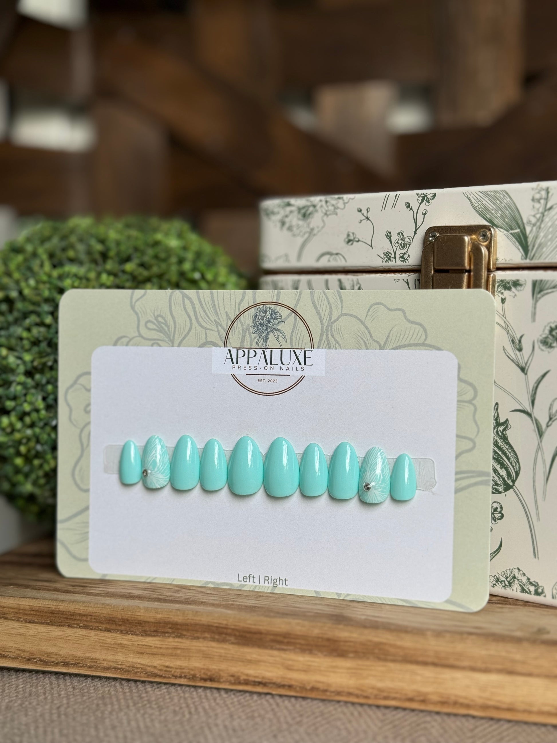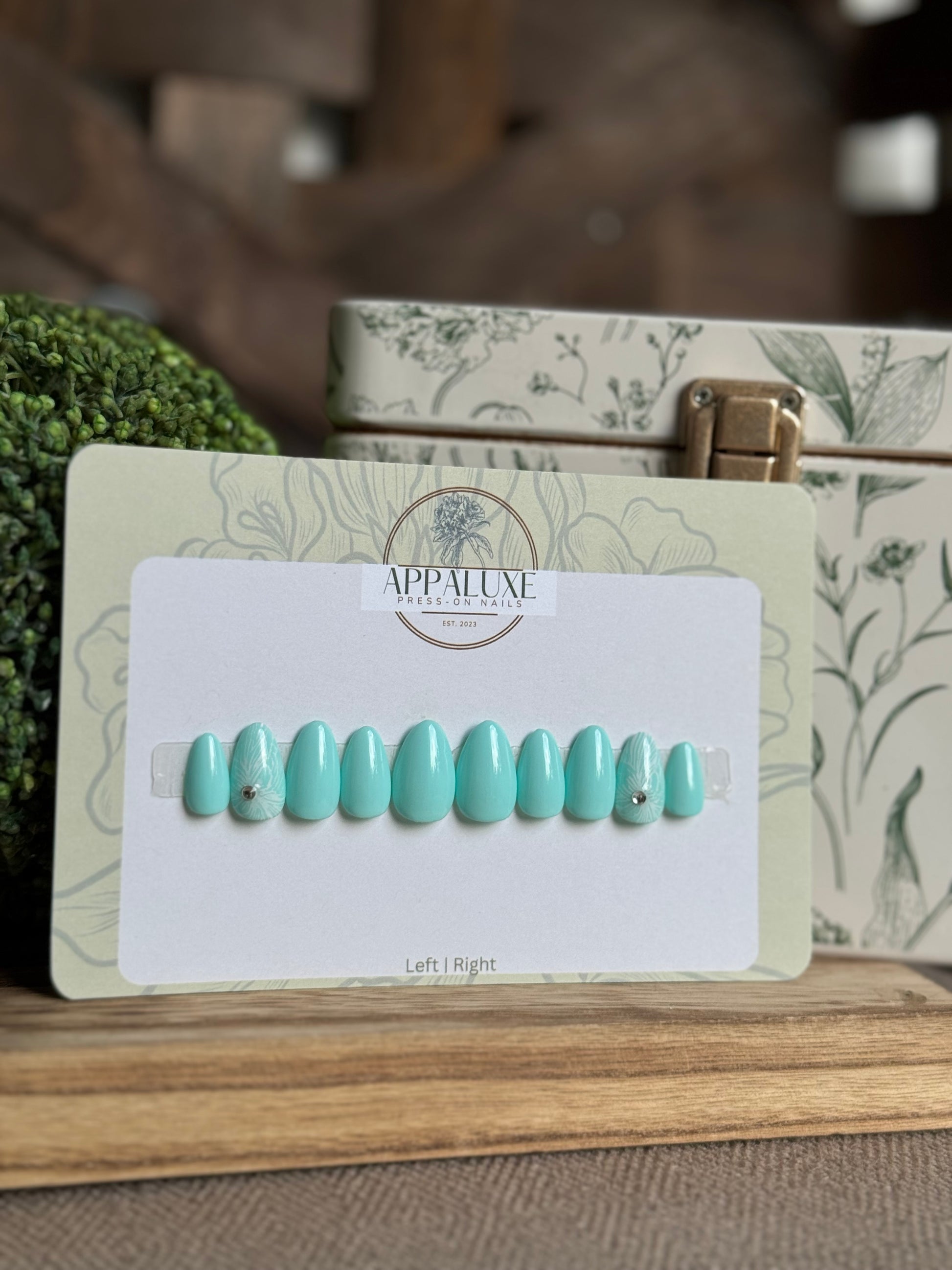 Escape to your own island paradise with OCEAN DREAM press on nails! These bright teal/blue nails are adorned with stamped tropical flowers and sparkling rhinestones, adding a touch of summer to even the coldest winter days. Perfect for beating the blues or bringing a bit of the tropics with you on your getaway.