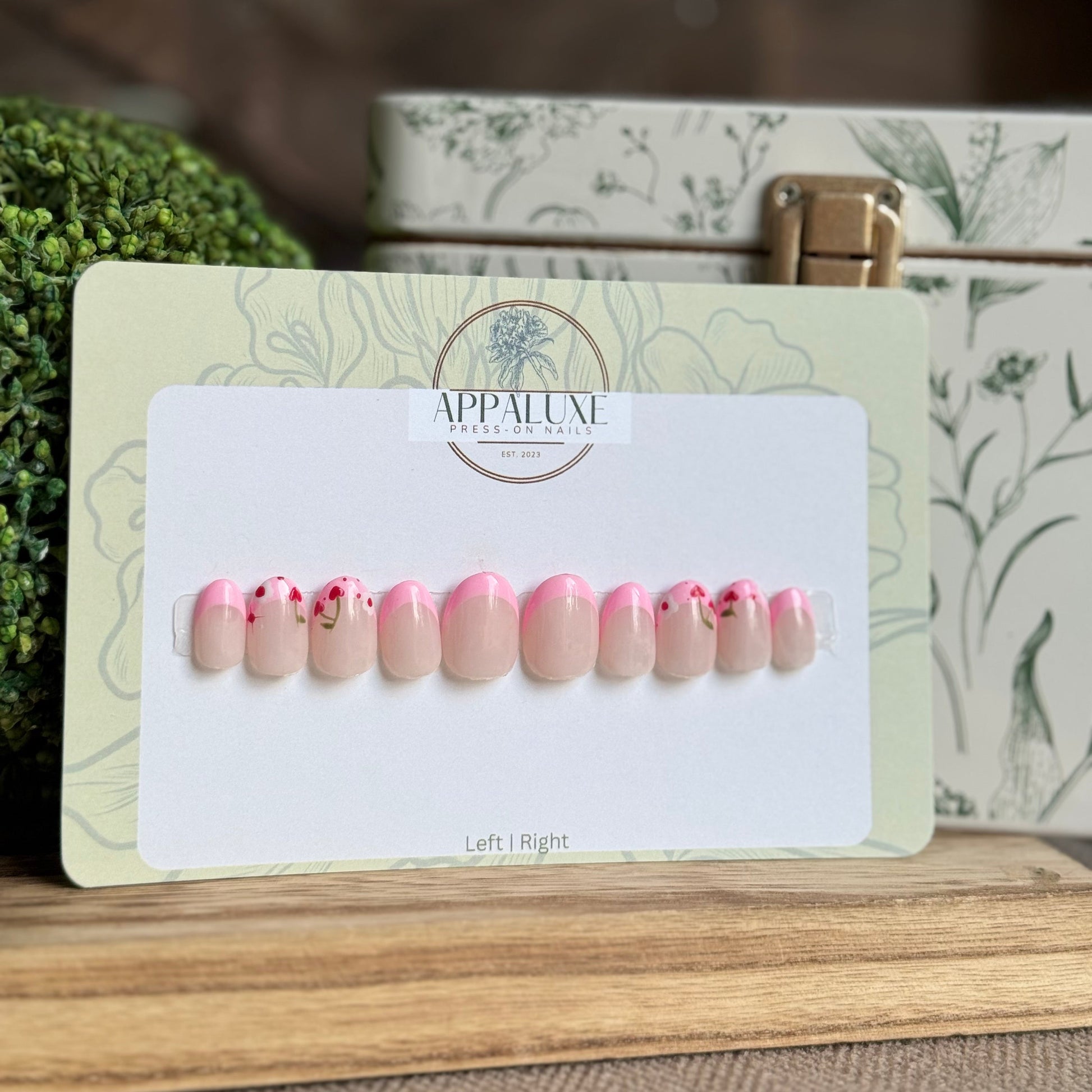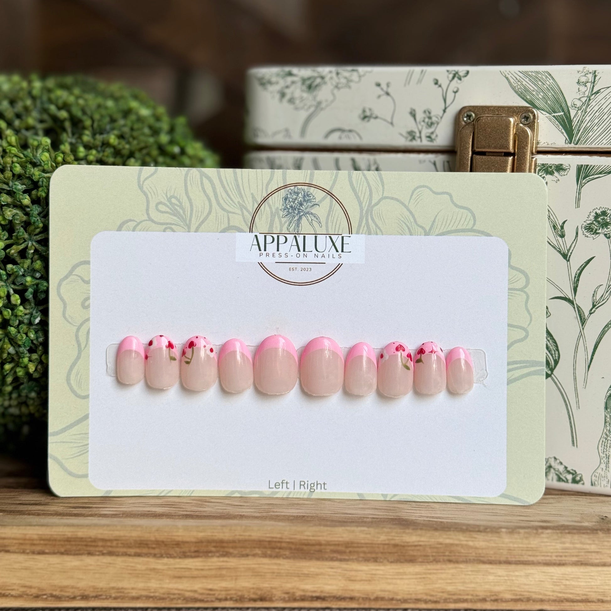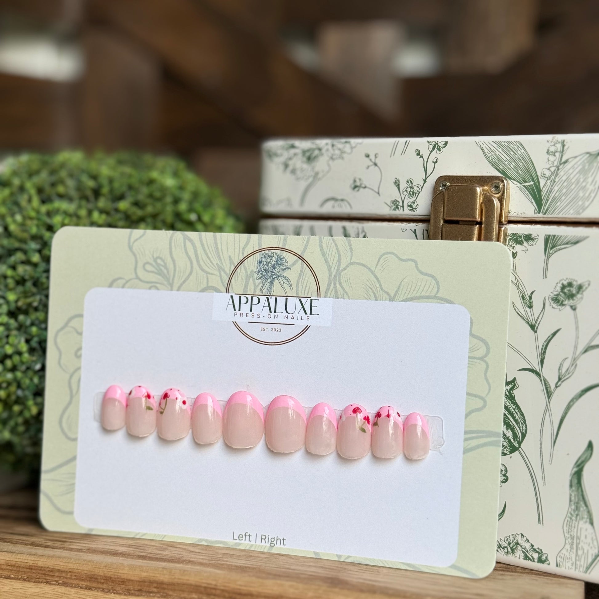 Indulge in the beauty of spring with CHERRY & BLOSSOMS! This French style press on nail features lovely red cherries, delicate white blossoms, and charming pink accents. Express your love for spring, summer, and florals with these perfect luxury press-on nails!