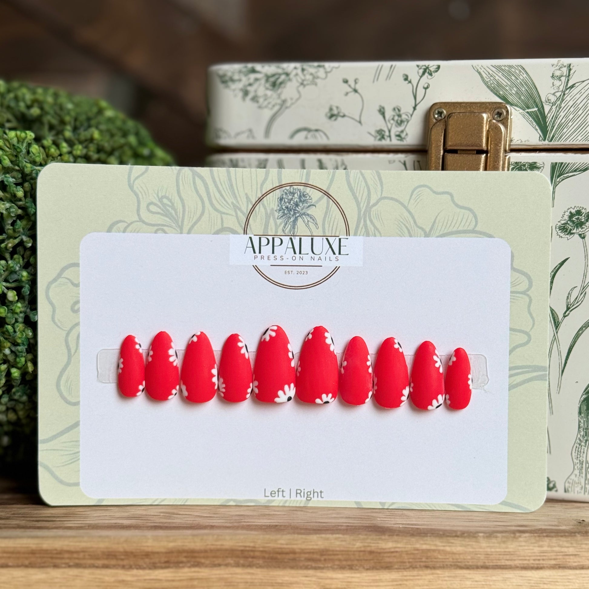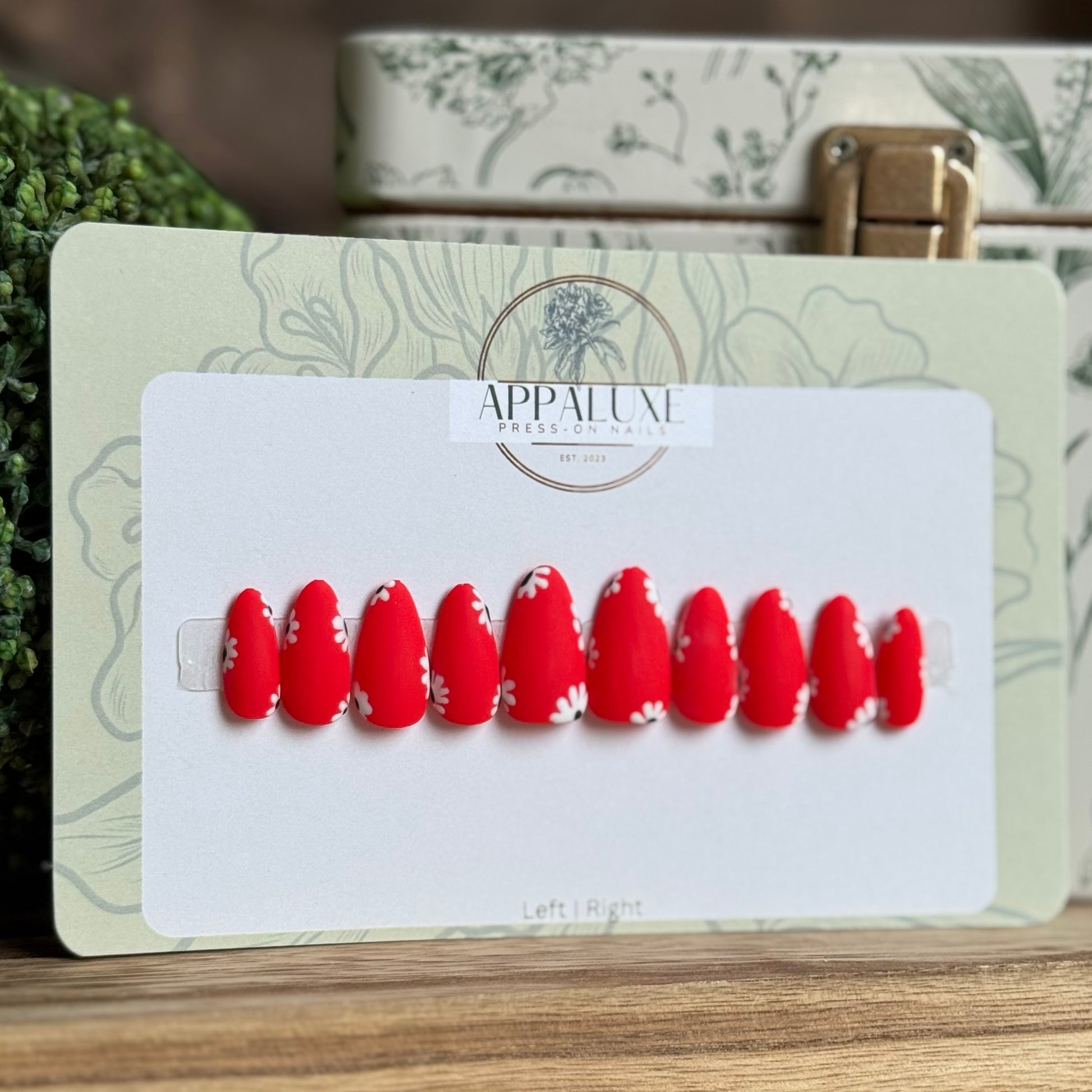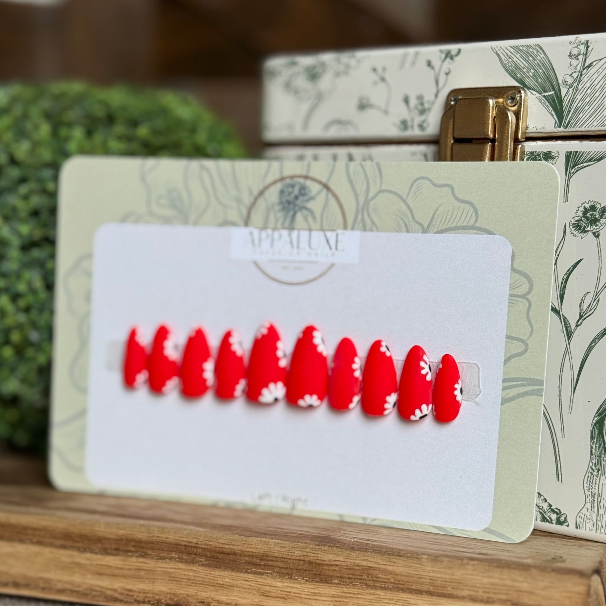Description: A bold red with daisies falling off each nail in different directions in a matte finish is a stunning nail that will truly test the “Red Nail Theory” This set was created with matte in mind but feel free to change that to glossy for a shine wow factor!