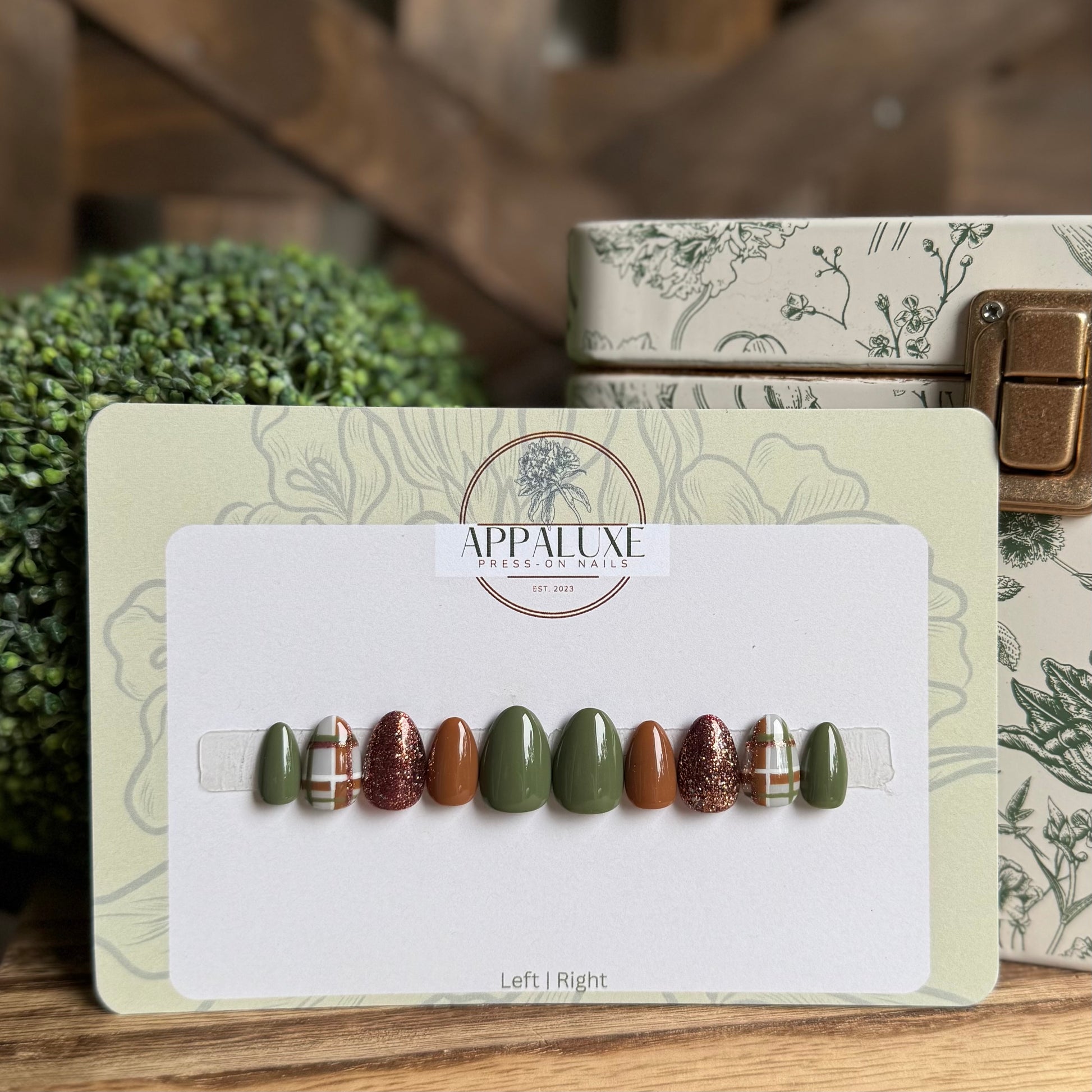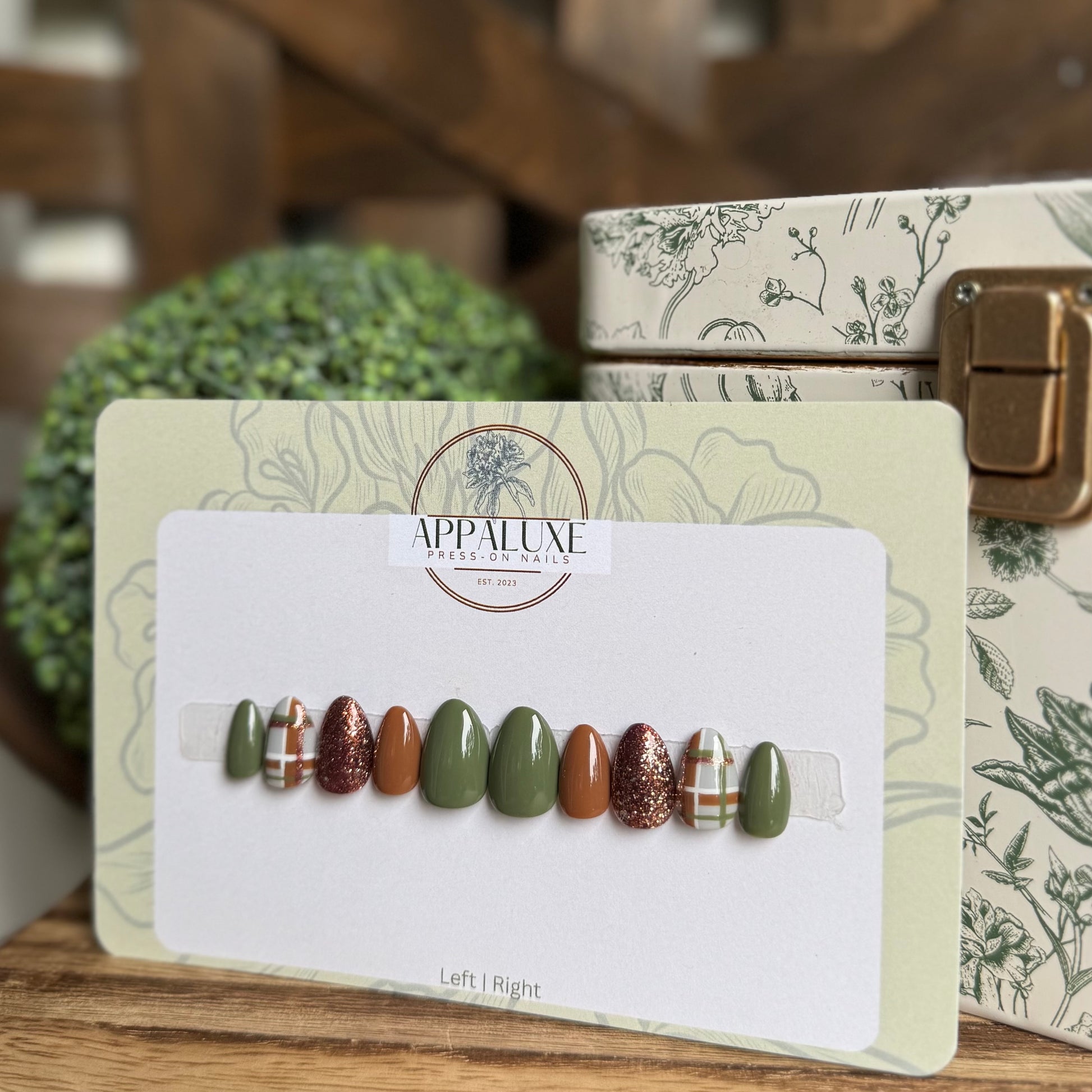 Embrace the spirit of fall with FLANNEL FEELS, our handmade press-on nails crafted in rich greens and warm browns. Subtle glitter accents add just the right sparkle, while the cozy flannel-inspired design invites comfort and style. Easy to apply and reusable, these nails bring a polished, seasonal look without the hassle. Perfect for layering your autumn outfits with effortless charm and warmth.