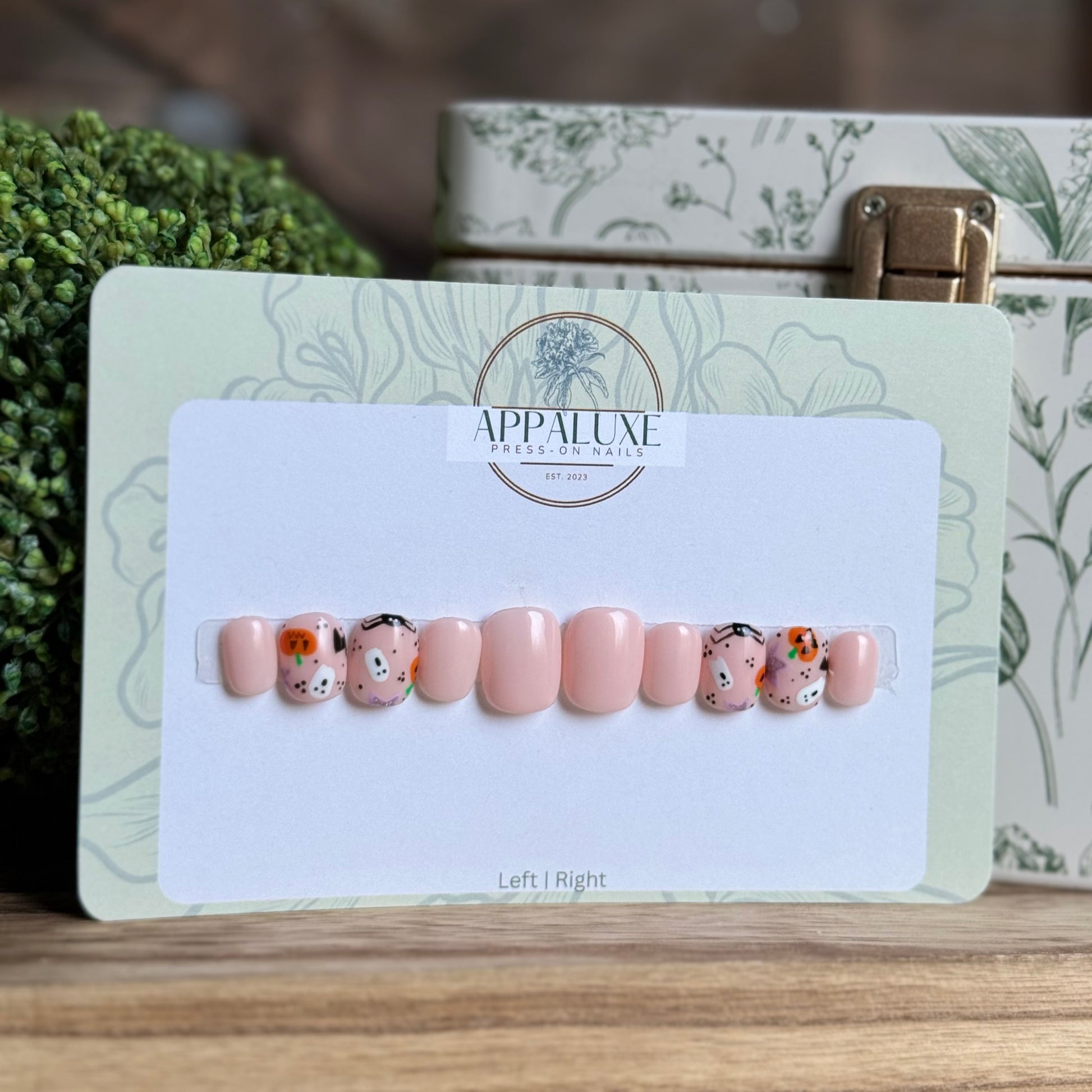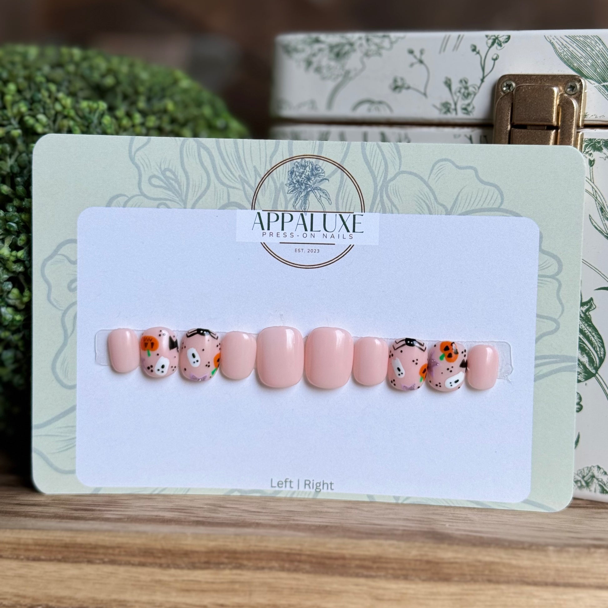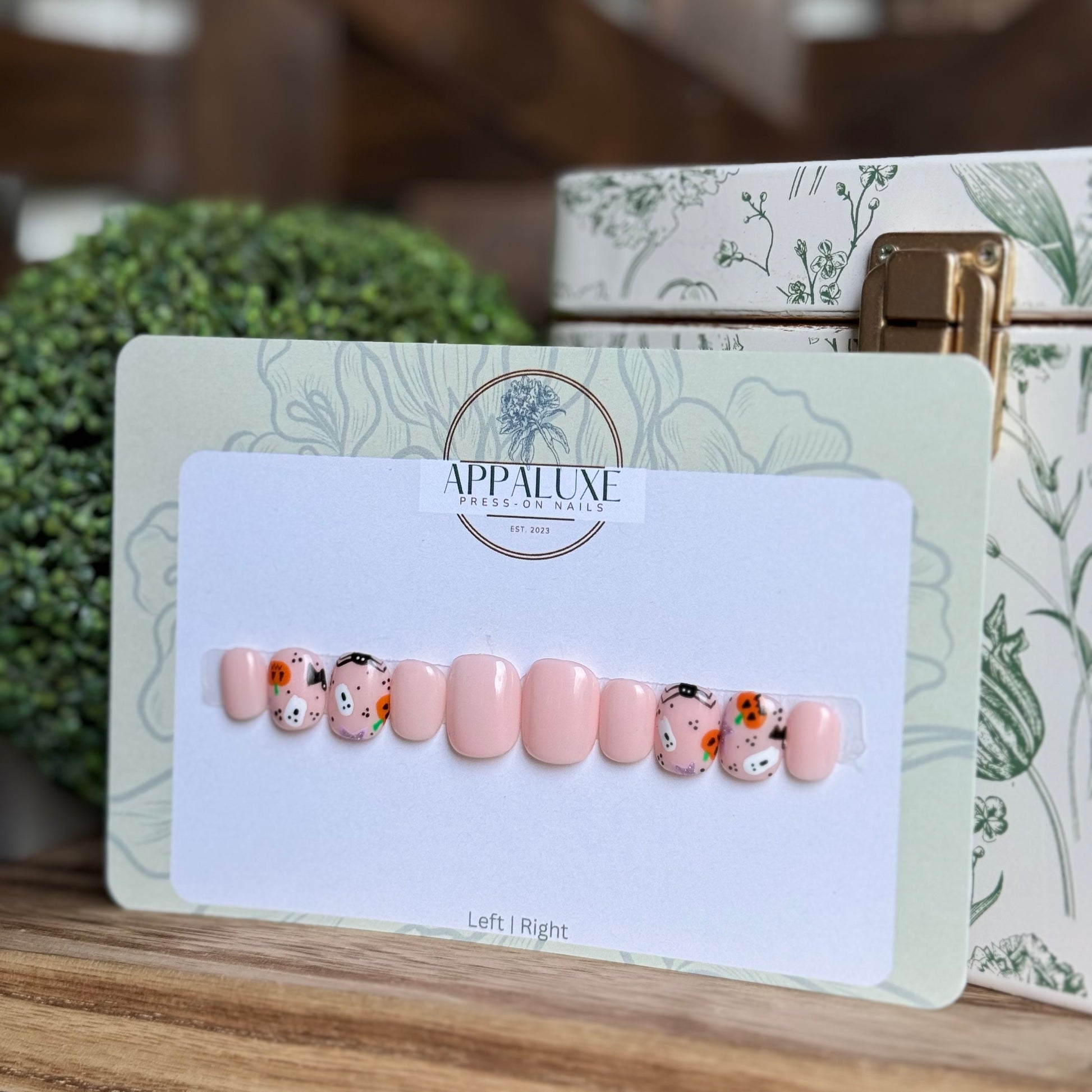 Ghouly Girl brings a spooky twist to your nails with light neutral pink color and playful accents of ghosts, bats, spiders, purple sparkle hearts, and jack-o-lanterns. Perfect for the girl who loves Halloween and stylish nails!