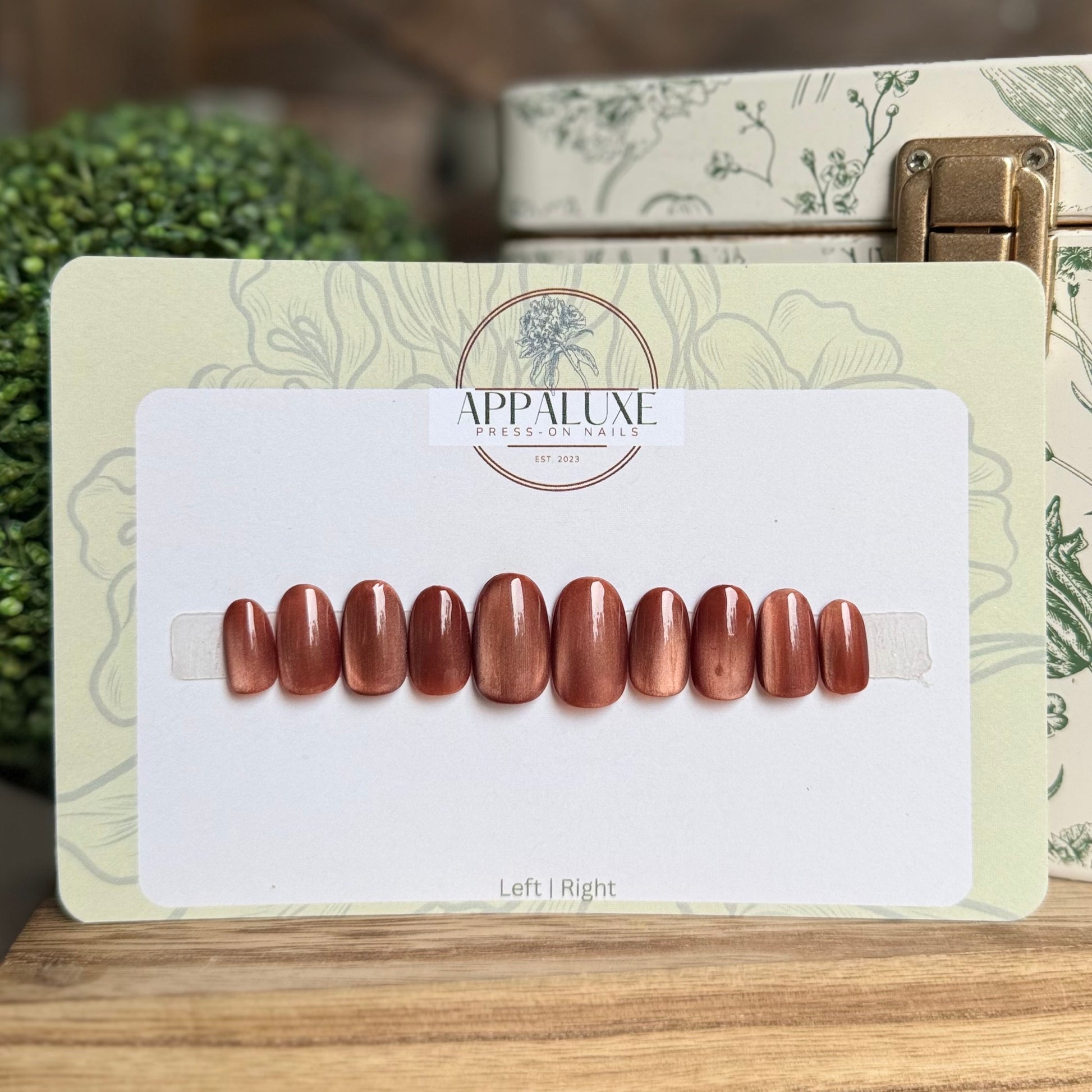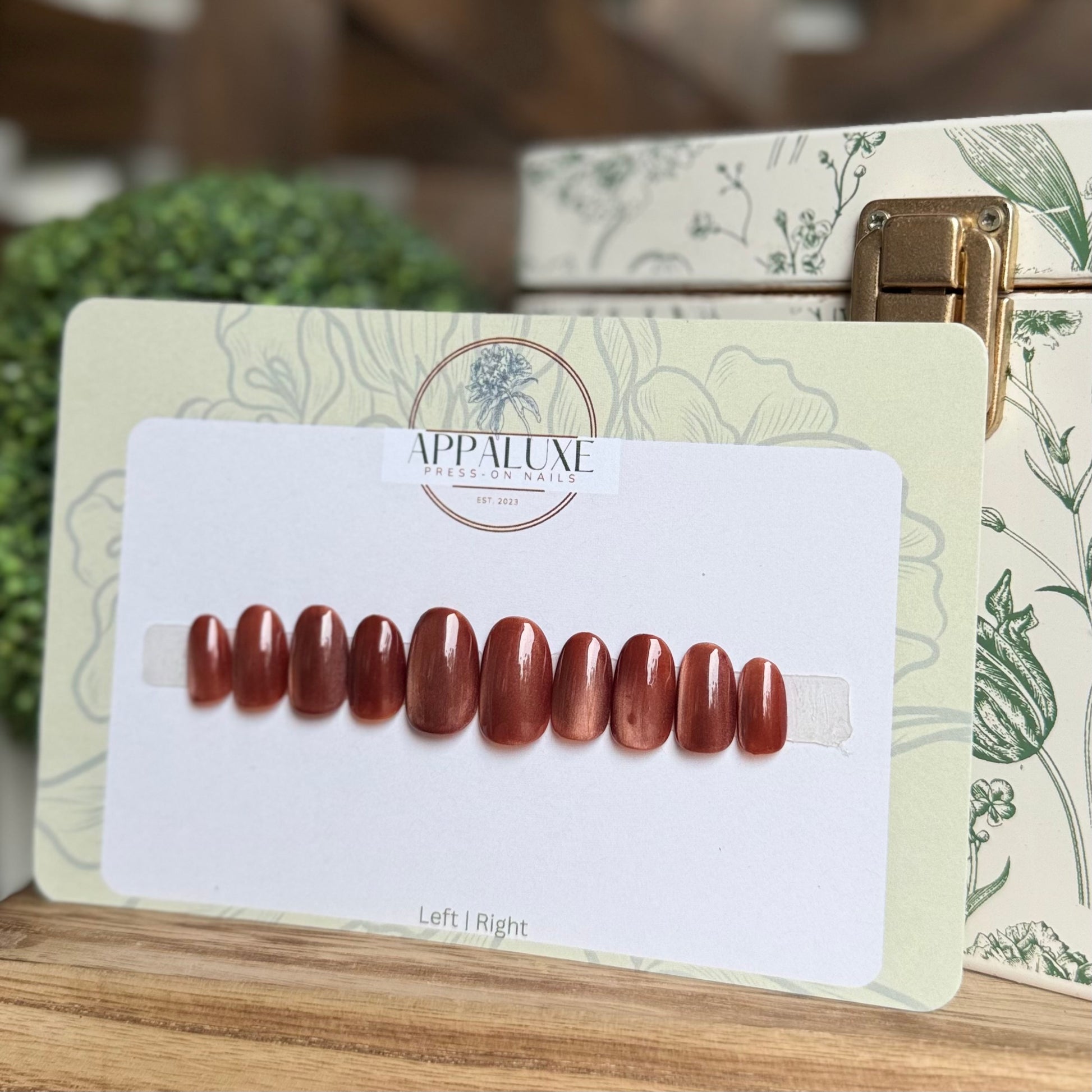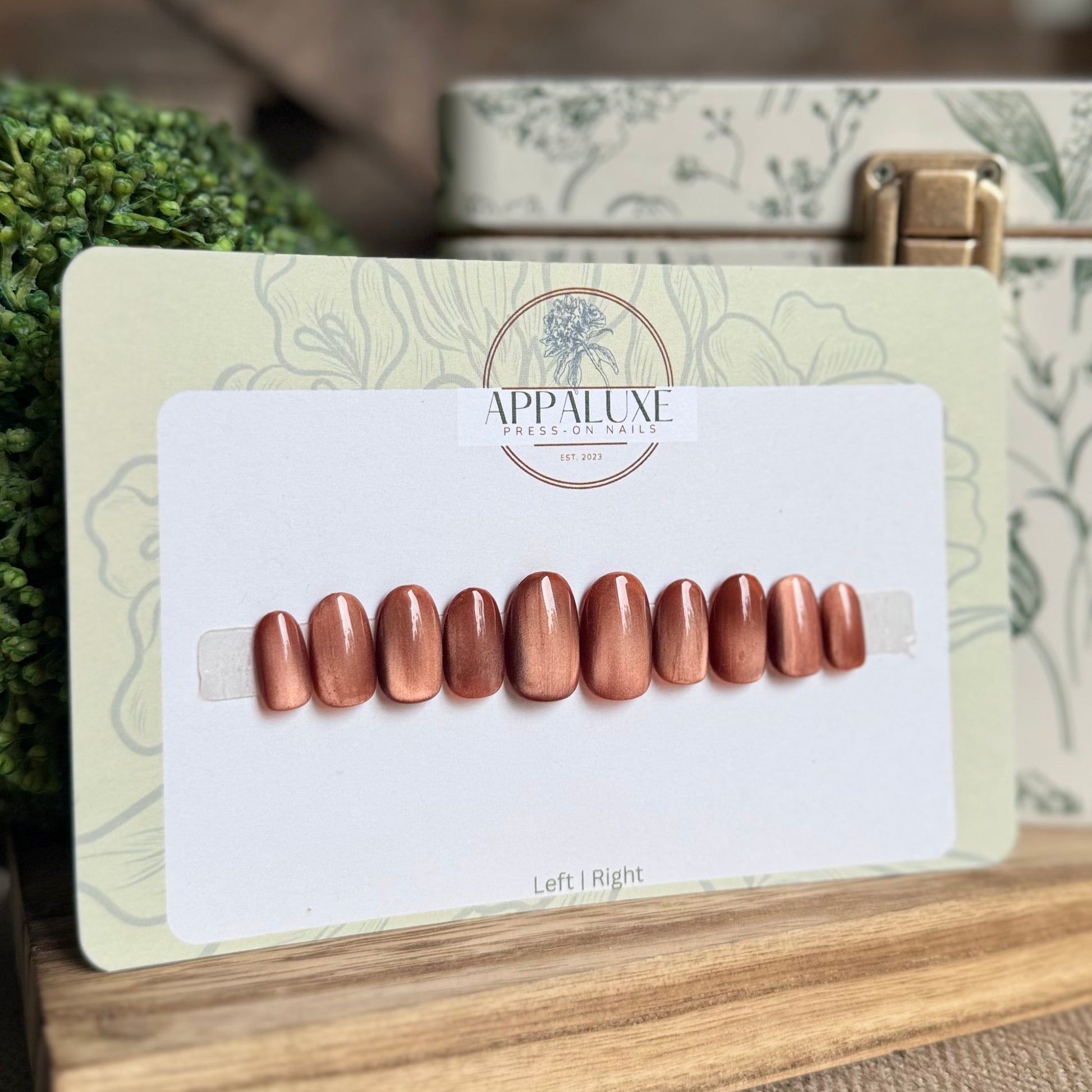 Capture the magic of autumn evenings with GOLDEN HOUR—a stunning silk cat eye press-on nail shade that glows like the sun’s last warm kiss. Perfect for fall and cooler seasons, these handmade nails shimmer with rich golden hues that dance with every movement, adding a playful sparkle to your look. Slip them on and let your nails shine as bright as the cozy, golden hour light!