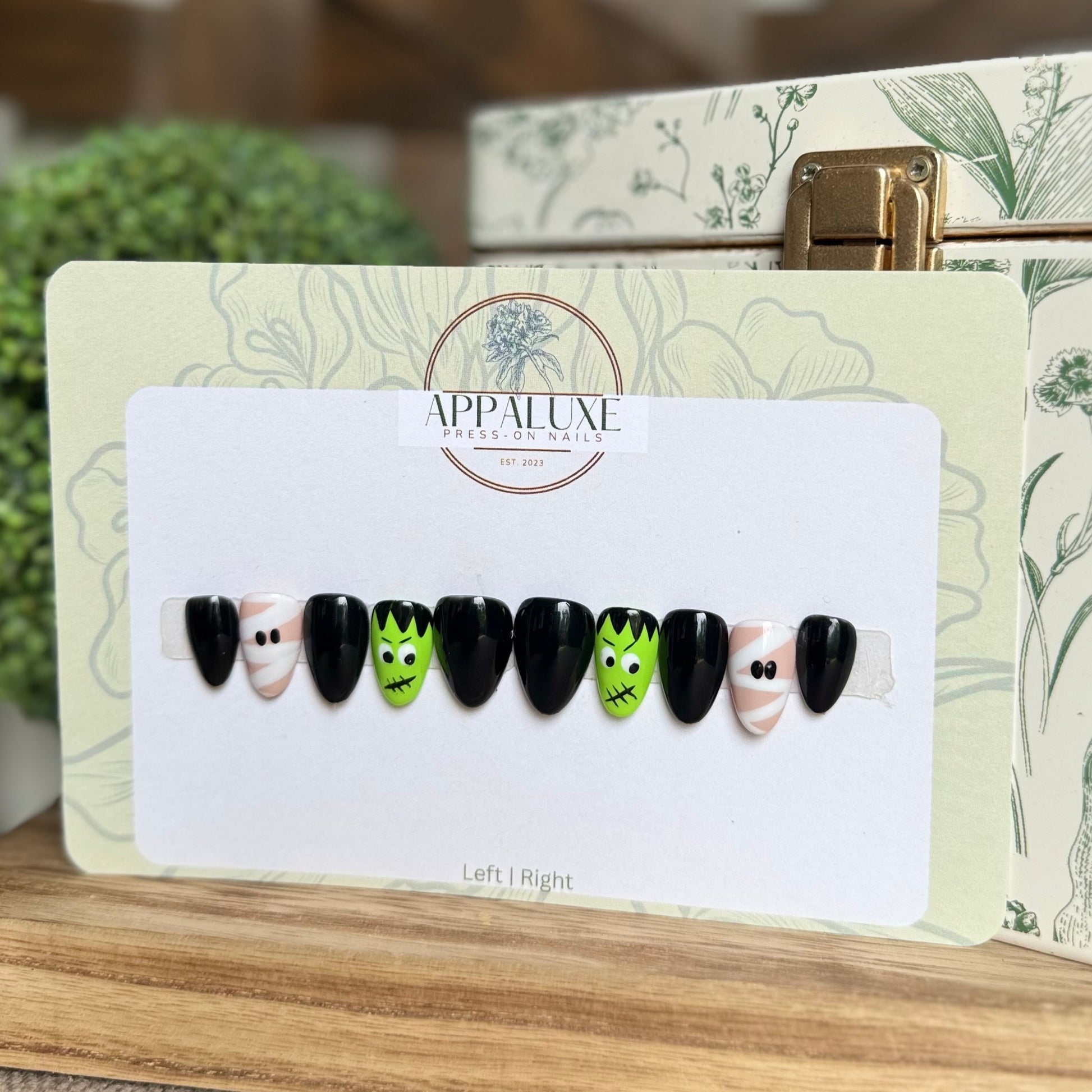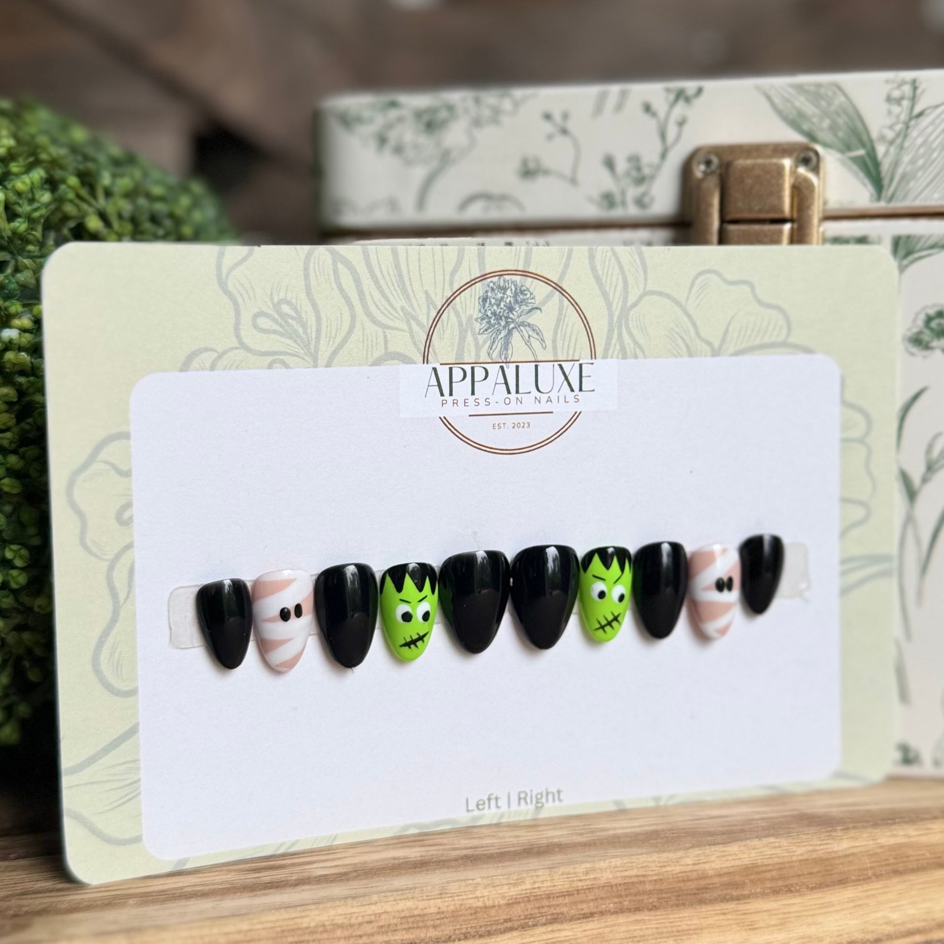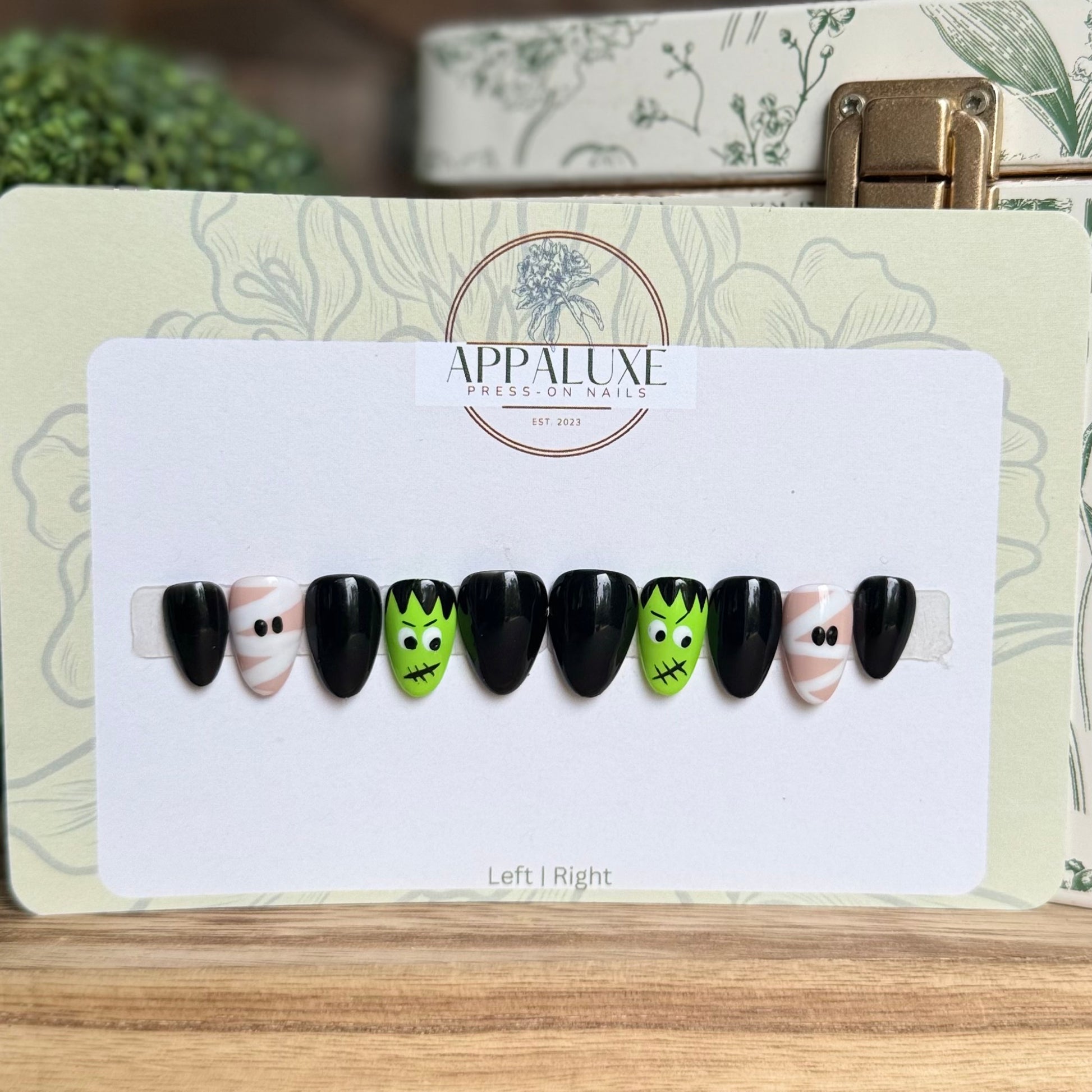 Get ready to party with Halloween Monster Mash nails featuring spooky mummies and silly green monster faces. These playful designs bring fun and festive vibes to your look, perfect for any Halloween celebration.