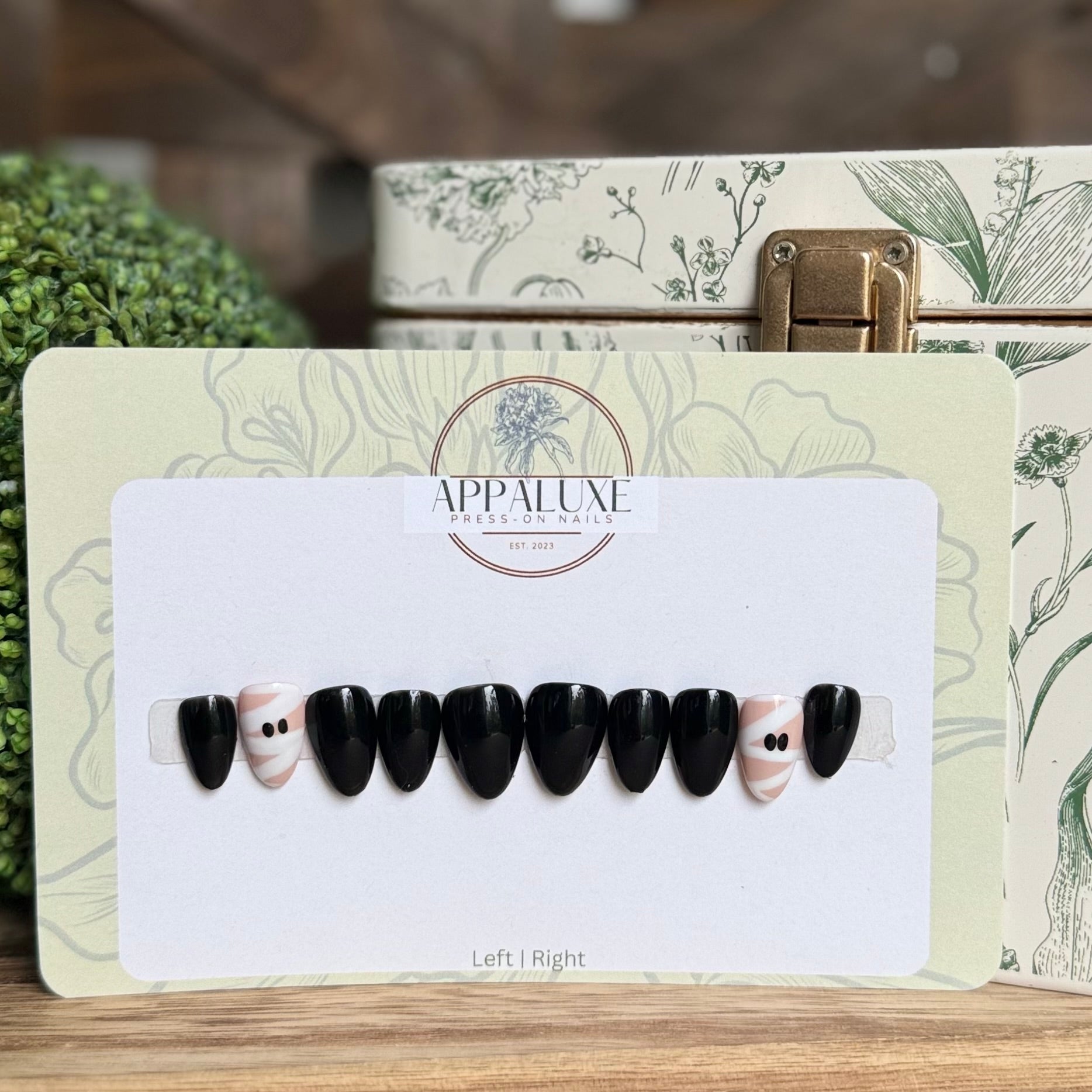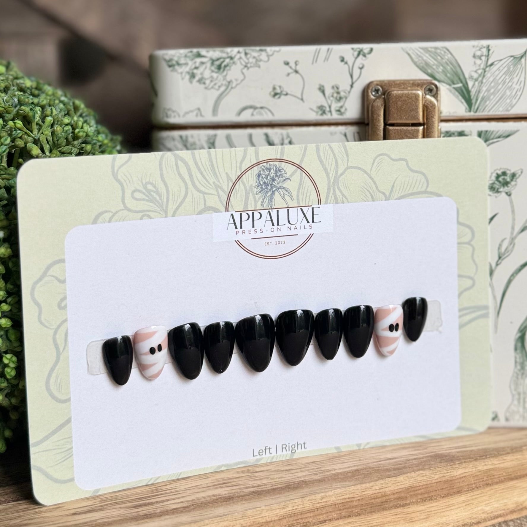 Get into the spooky spirit with our Halloween Mummies press-on nails! Featuring cute mummy faces paired with sleek black luxury nails, these easy-to-apply nails add a playful and mysterious touch to your Halloween look. Perfect for a quick transformation without the mess, they deliver fun, style, and festive flair in one chic set.