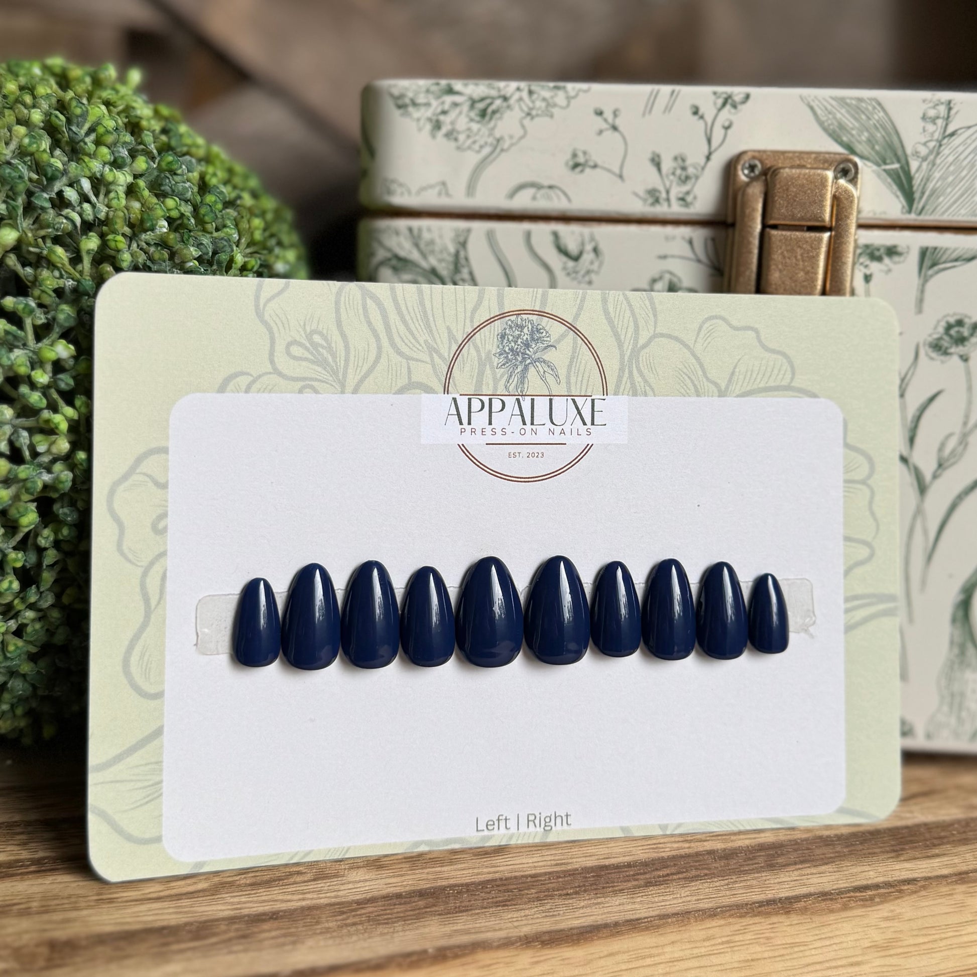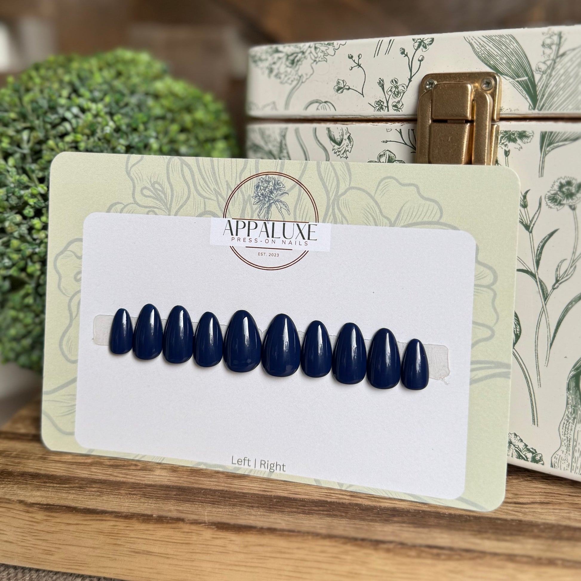 Add a pop of sophistication with these navy blue luxury press-on nails. Perfect for any occasion, they offer an easy, mess-free way to elevate your look instantly. Durable and stylish, these nails bring a playful touch of elegance right to your fingertips. Slip them on and shine in style!