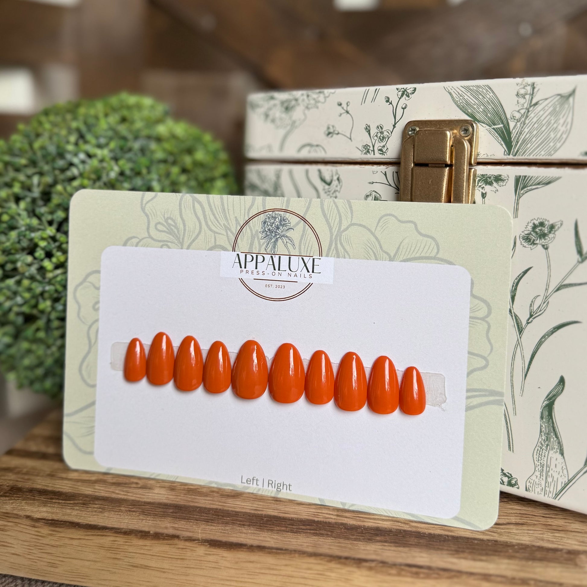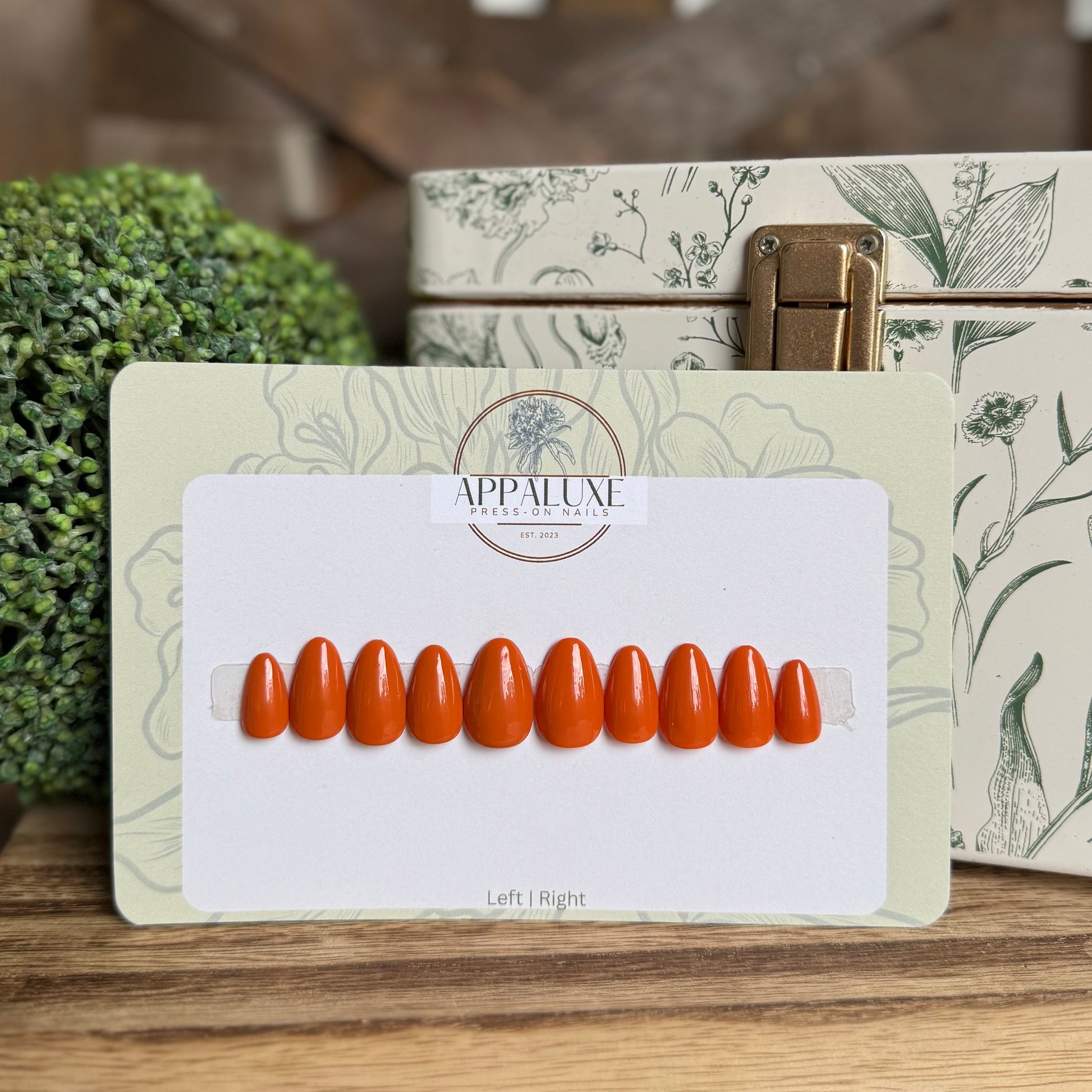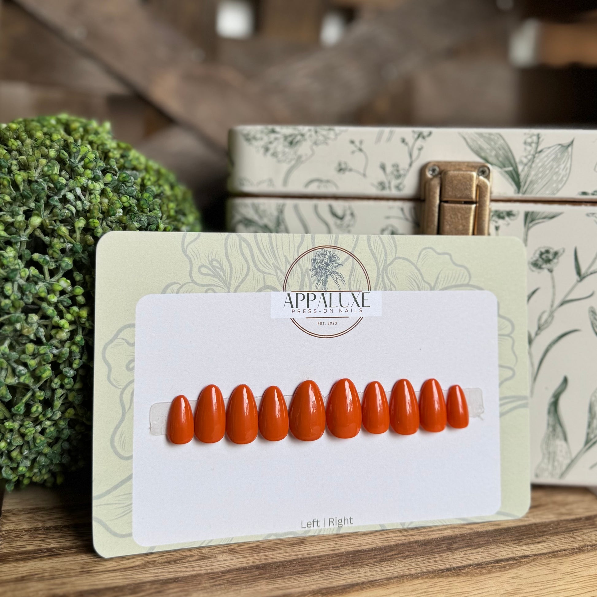 SPICED YAM combines sophisticated design with rich burnt orange tones to create a luxury press-on nail experience. Expertly crafted for a flawless finish, these nails offer durability alongside striking color depth, elevating your manicure with minimal effort. Ideal for professionals and enthusiasts seeking a refined yet bold look, SPICED YAM delivers precision and style in every set.