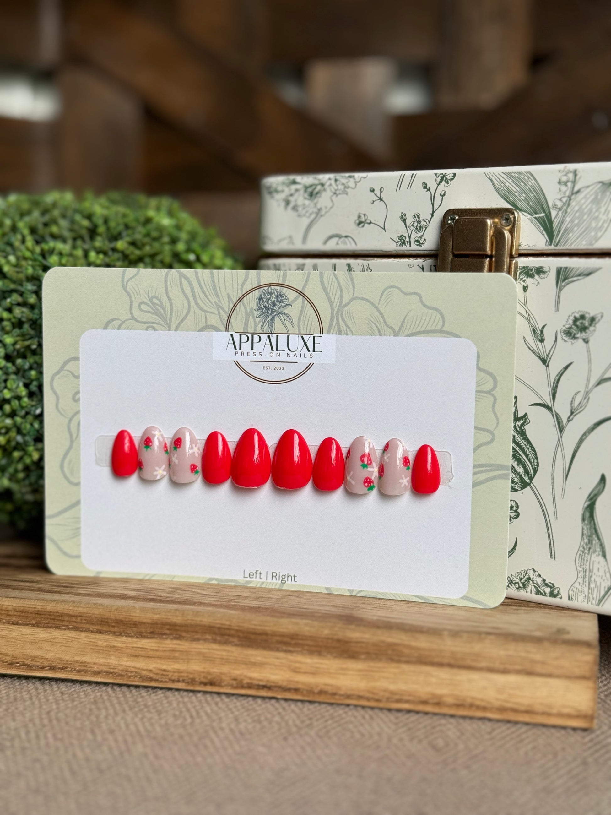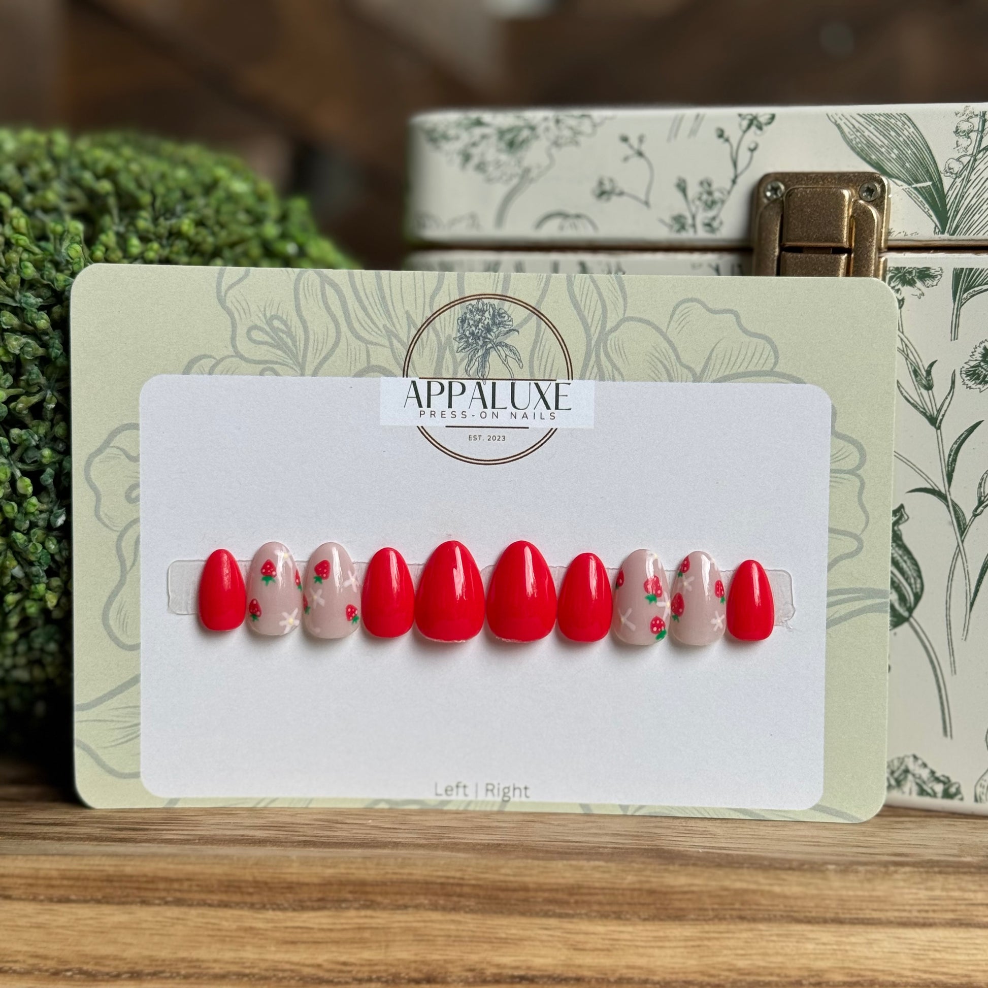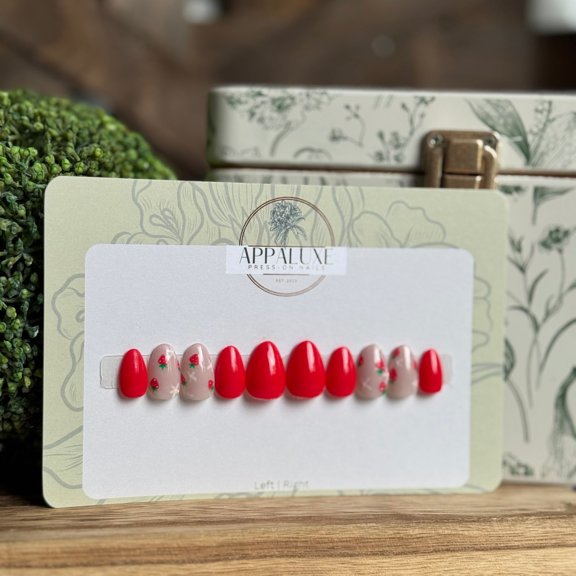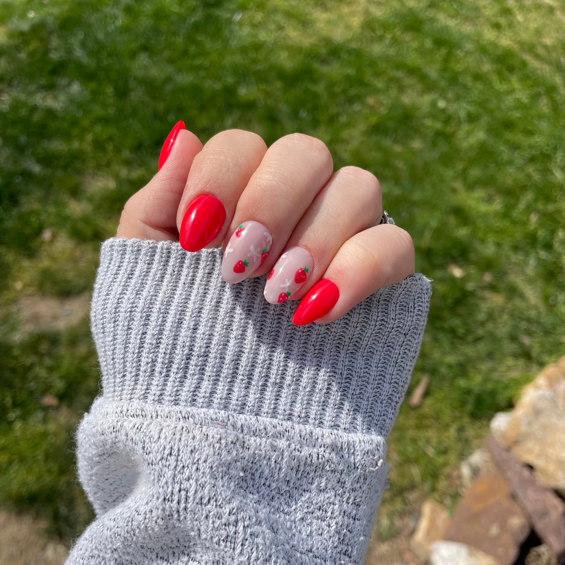 Bright red and creamy white accents make the perfect summer nails. Dainty strawberries surrounded by tiny white flowers pull the whole look together. These nails are so pretty and bold in person. (I have a set myself and received SO many compliments on them)