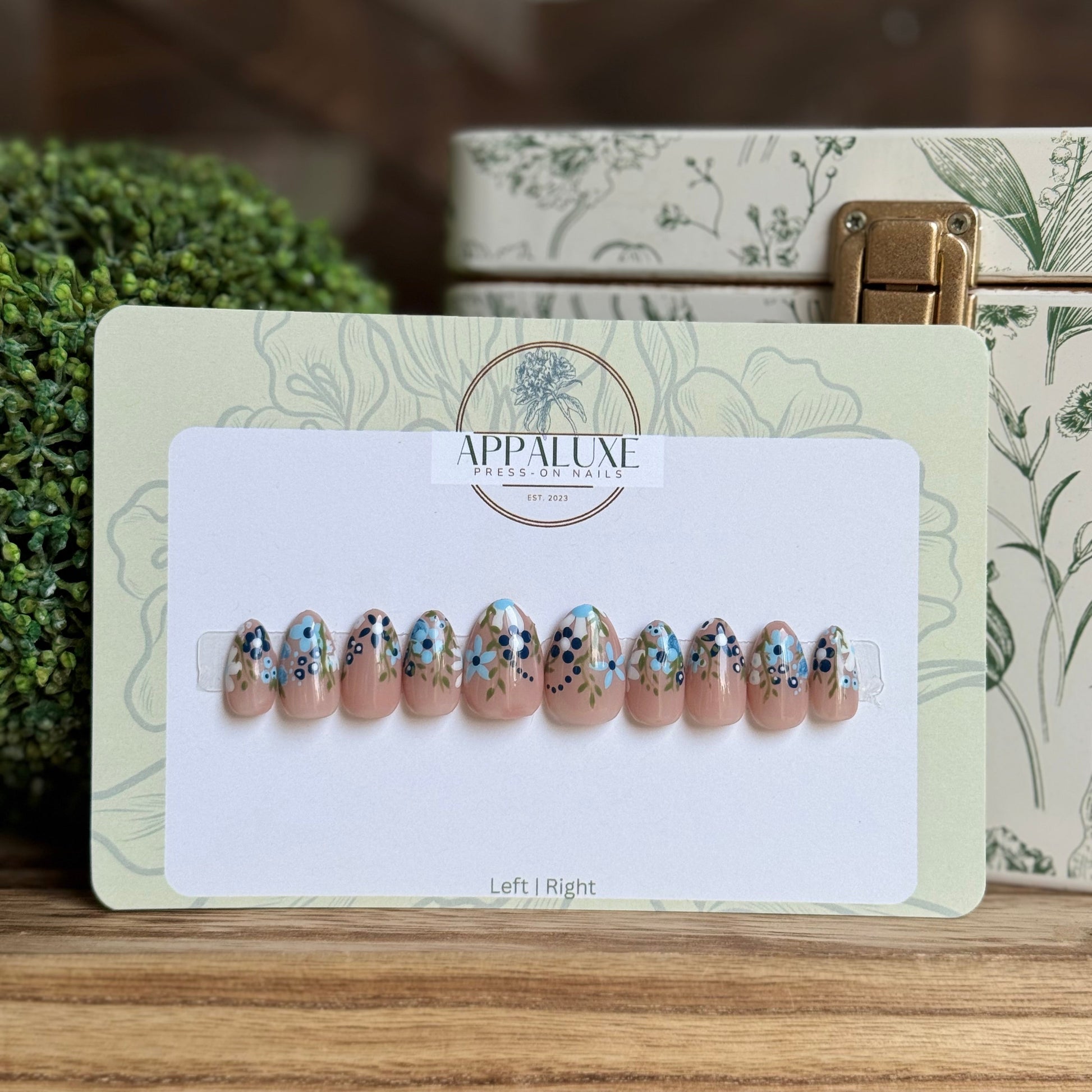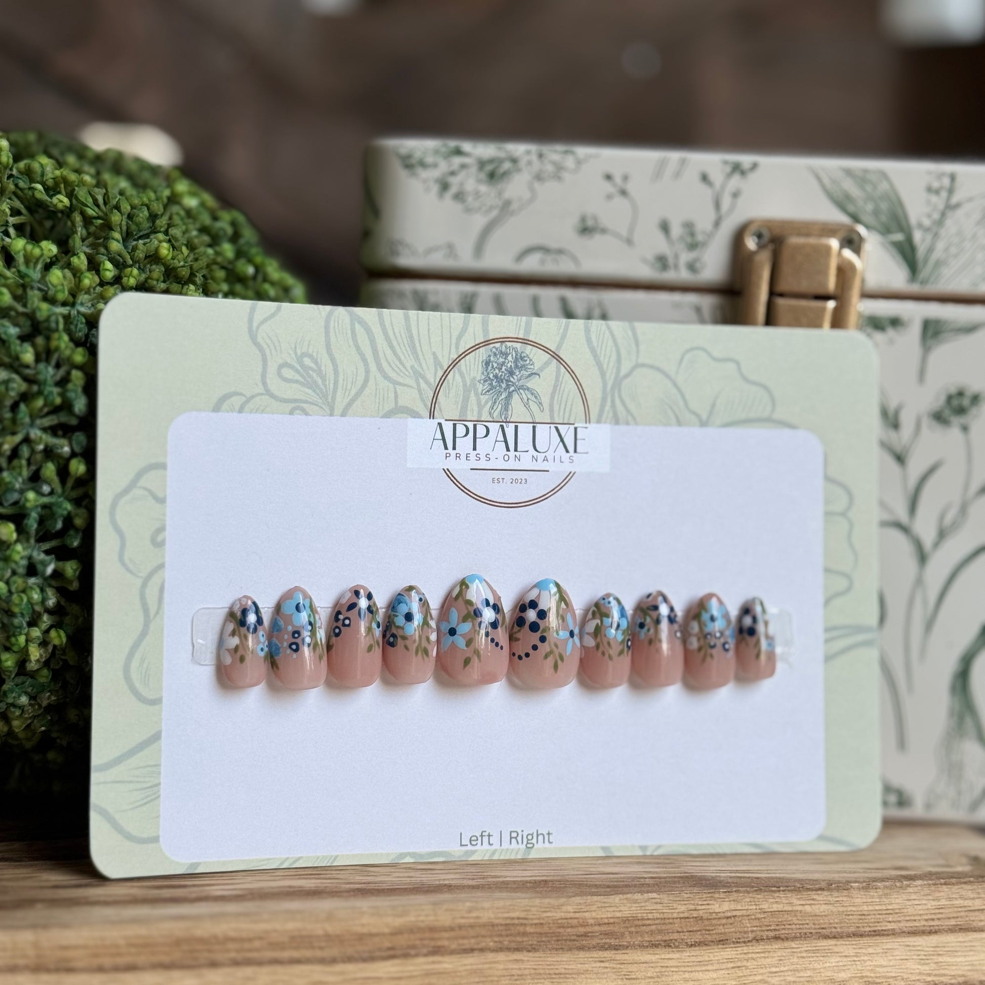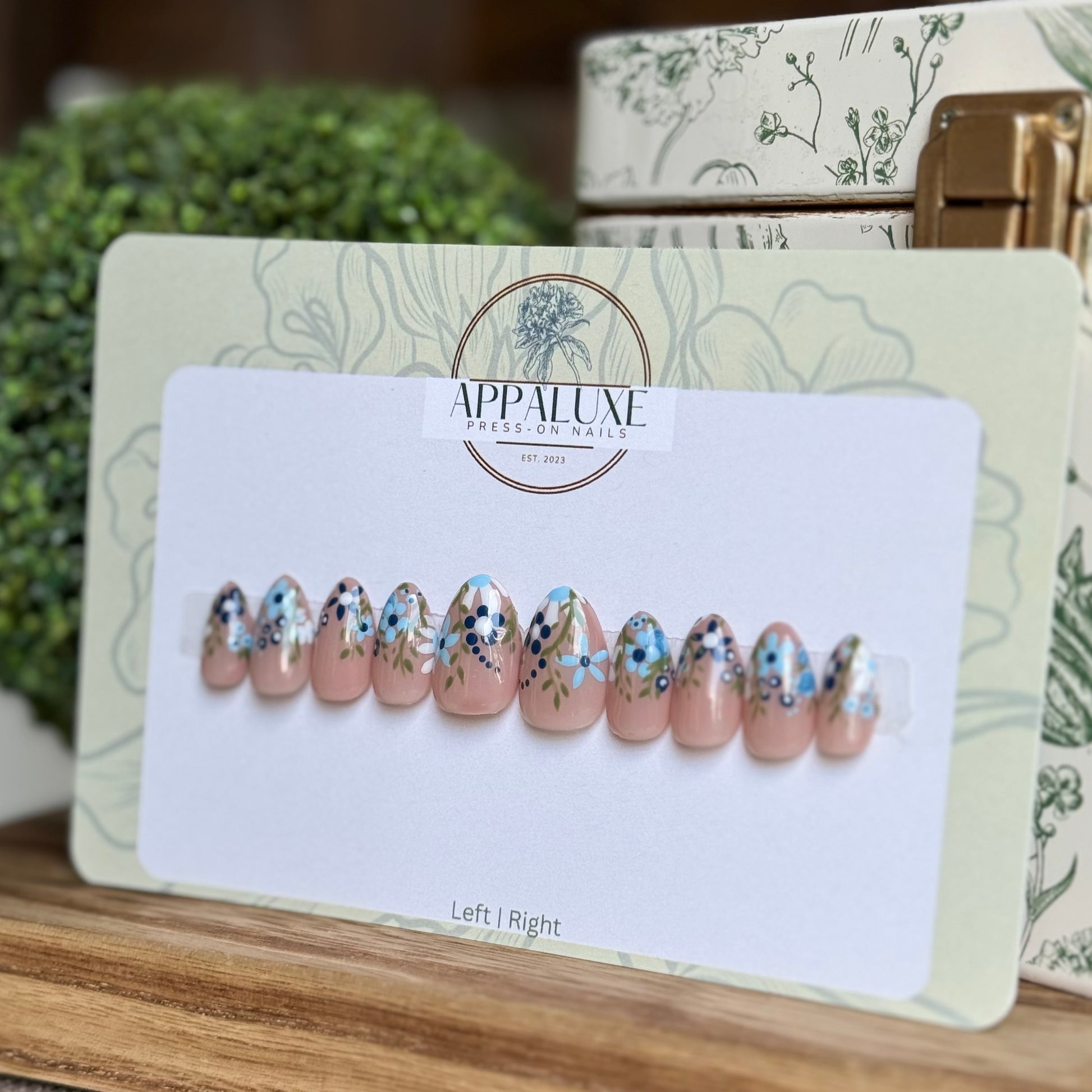 Get a wild and unique look with TEXAS WILDFLOWERS! These stunning press-on nails feature a beautiful blue flower design on a warm neutral base. Perfect for adding a pop of color to any outfit. (Get your flower power on!)