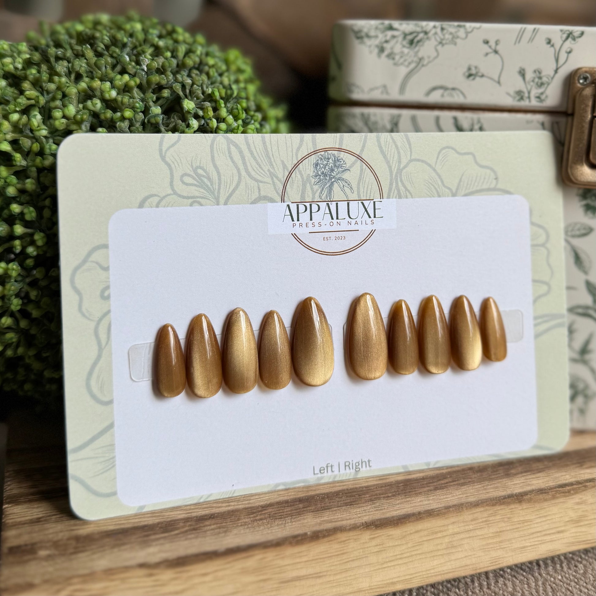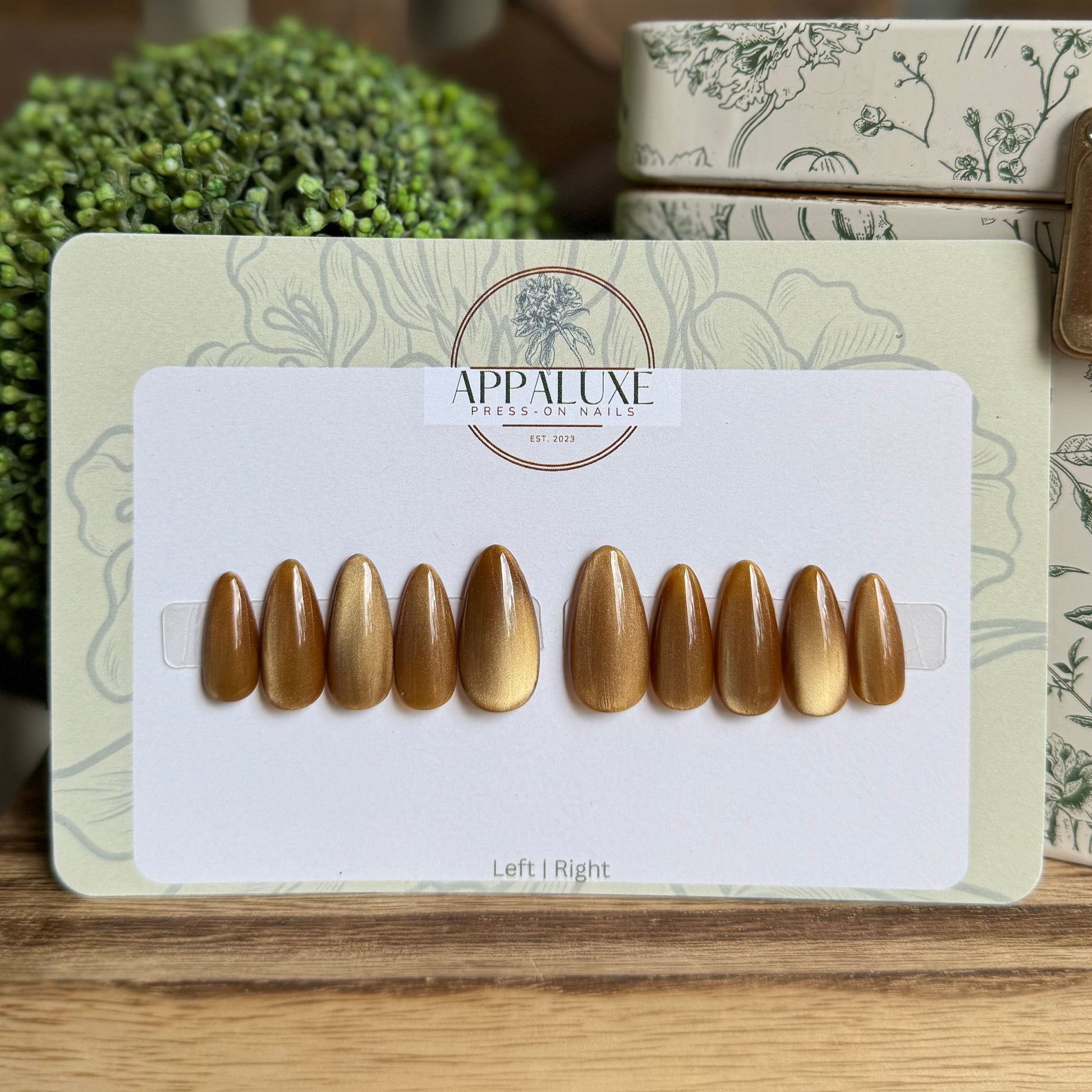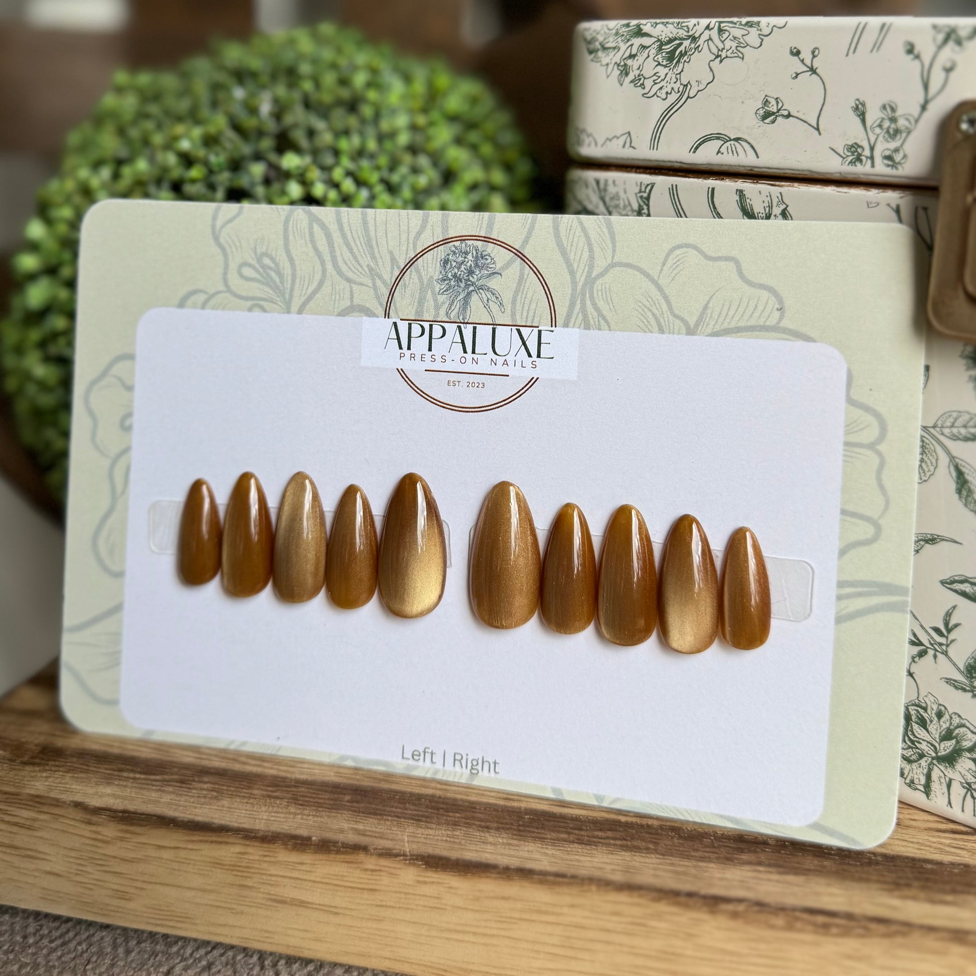 Elevate your style with THEIA’s bold gold brown silk cat eye nails. These stunning nails capture the perfect blend of elegance and edge, featuring a lustrous silk finish that catches the light with every movement. The rich gold brown hue adds warmth and sophistication, making your hands an instant focal point. Ideal for making a statement at any occasion, THEIA nails offer a captivating, polished look that effortlessly enhances your confidence and charm.